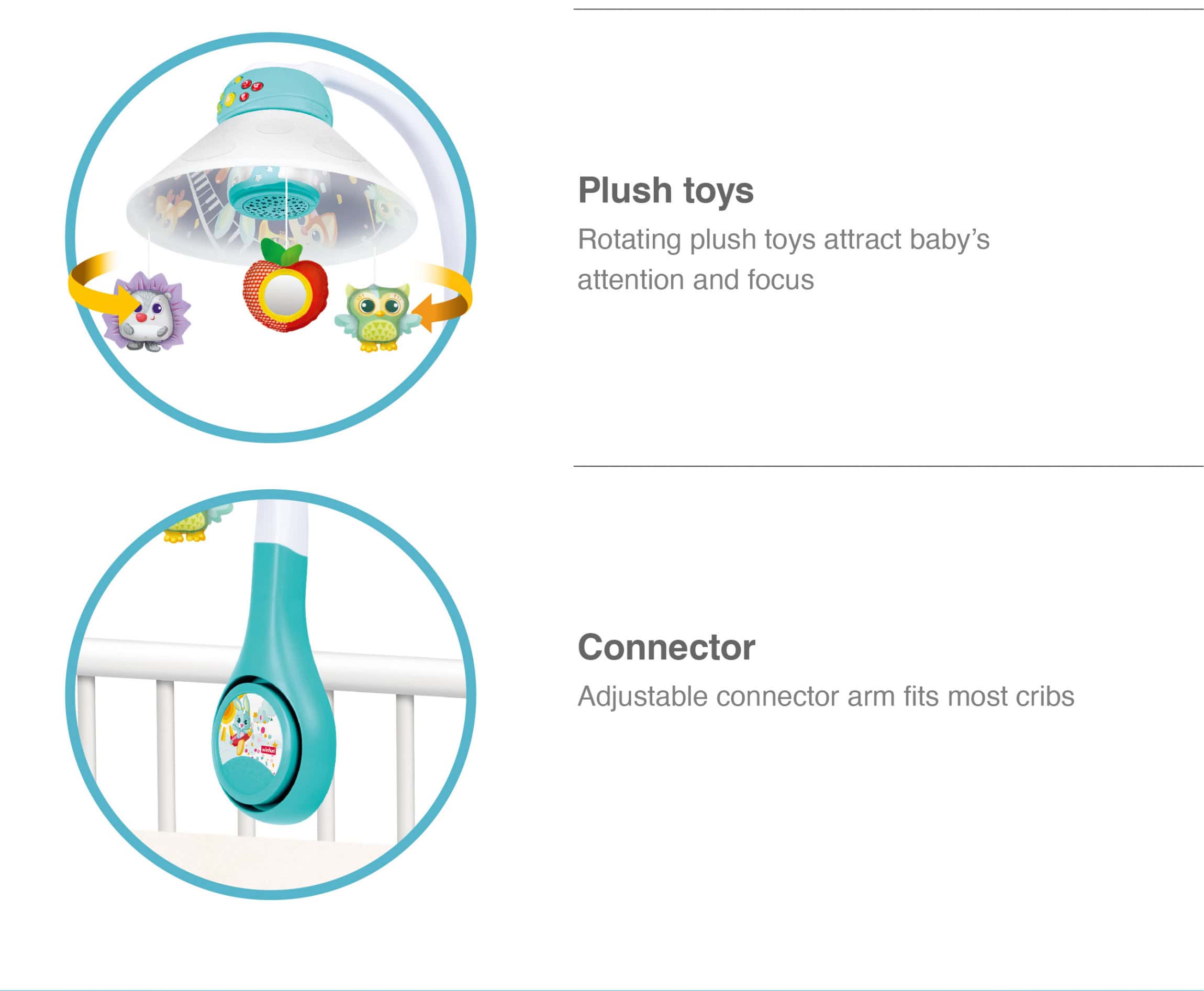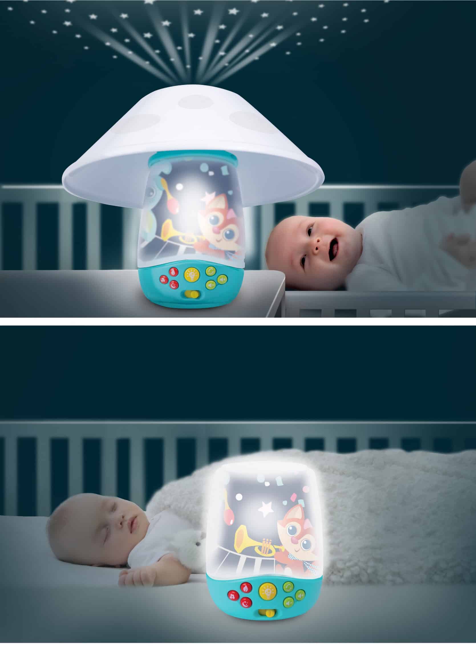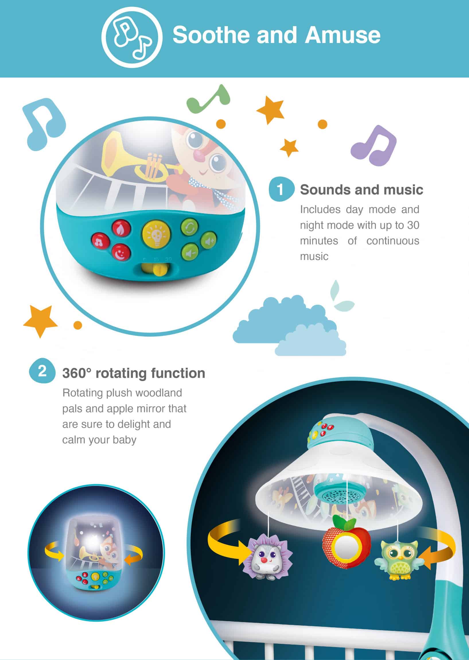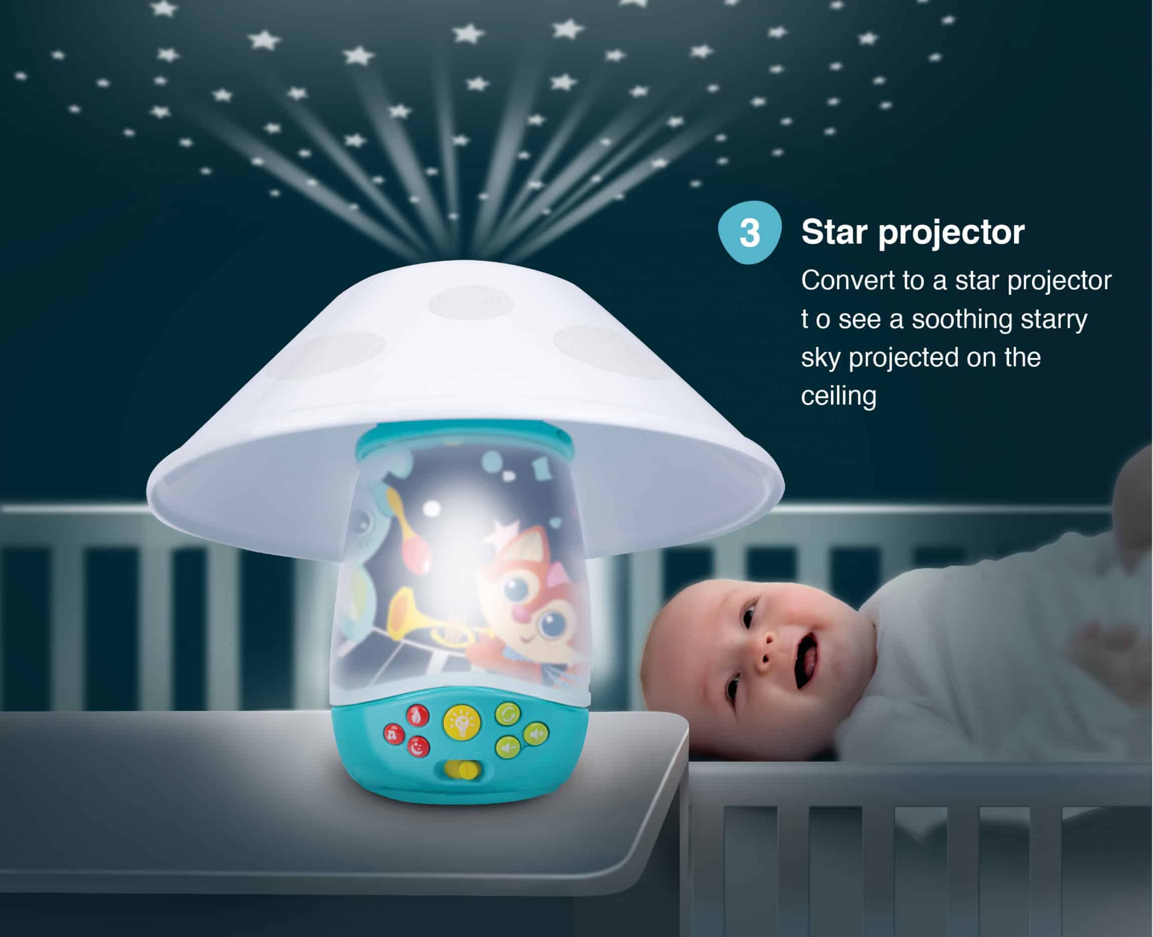 • Settle baby for sweet dreams with this soothing 3-in-1 projector mobileIncludes 3 different modes with up to 30 minutes of continuous music• Attach to the crib as a projector mobile with 3 cute rotating woodland pals• Convert to a star projector to see a soothing starry sky projected on the ceiling• Convert to a sweet woodland friends nightlight•Features day mode with cheerful tunes plus night mode with soothing lullabies, nature sounds and fun sounds•All modes include calming lights and soothing lullabies for a comforting sleeptime routine