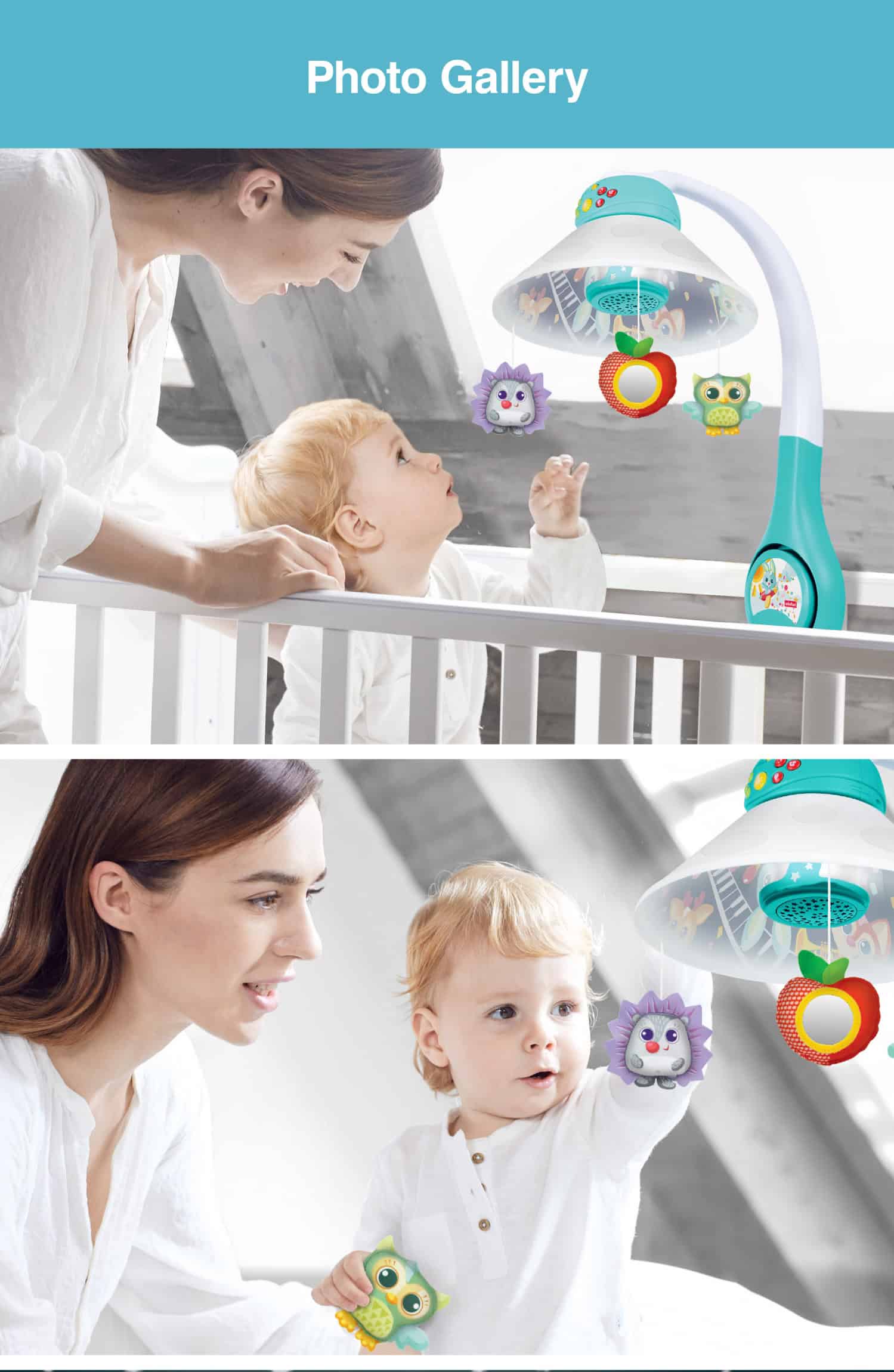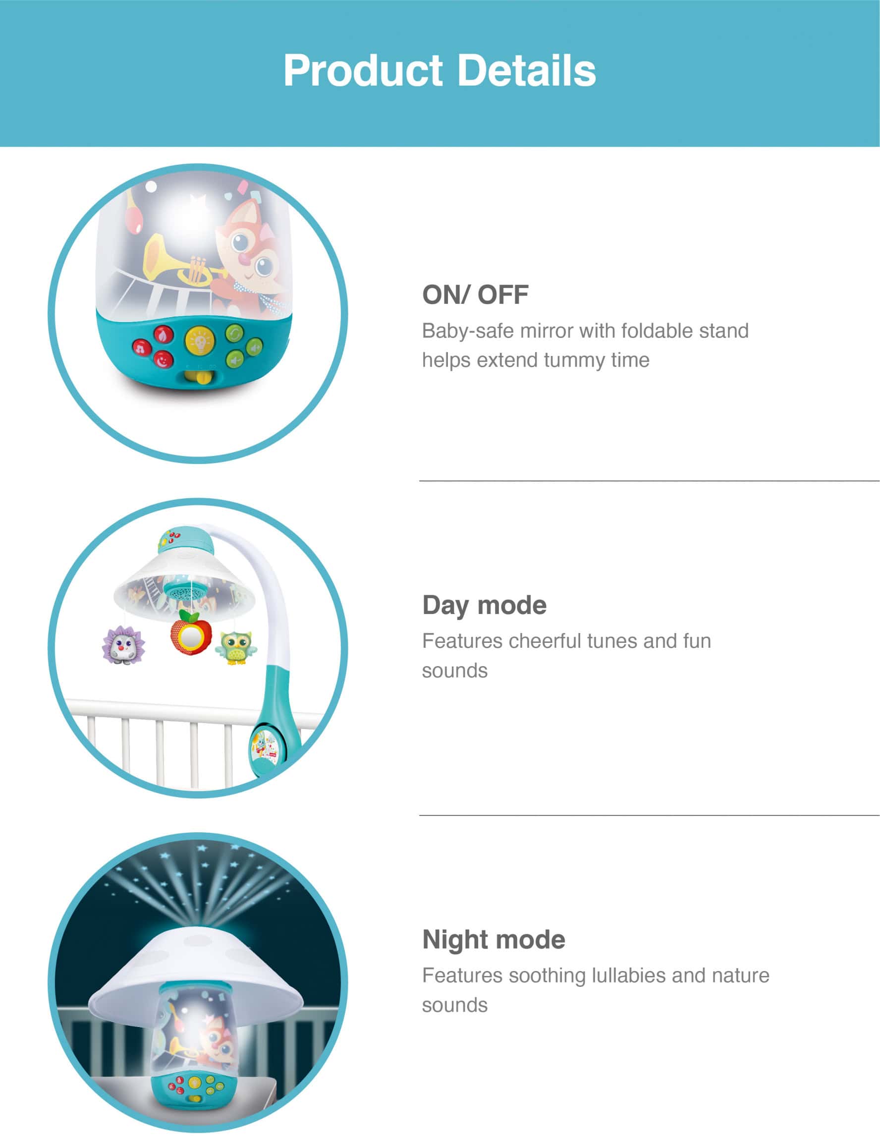 • โปรเจคเตอร์ โมบาย มีเสียง 3 ใน 1 Woodland Pals ให้ลูกน้อยหลับสบาย• โมบาย ดนตรีพร้อมเพลงกล่อม กล่อมนานถึง 30 นาที และผองเพื่อนในป่าแสนน่ารักปรับใช้ทั้ง 3 แบบได้ง่าย•ติดโปรเจคเตอร์ โมบายกับเตียงกล่อมลูกน้อย กับสัตว์แสนน่ารัก•สามารถเปลี่ยนเป็นเครื่องฉายดวงดาวบนเพดานกล่อมลูกน้อย• มีแสงไนท์ไลท์ปรากฎ เหมาะสำหรับการมองของเด็กๆ•ทุกโหมดจะมีแสงไฟและเสียงเพลงกล่อมน้องนอนให้หลับสบาย