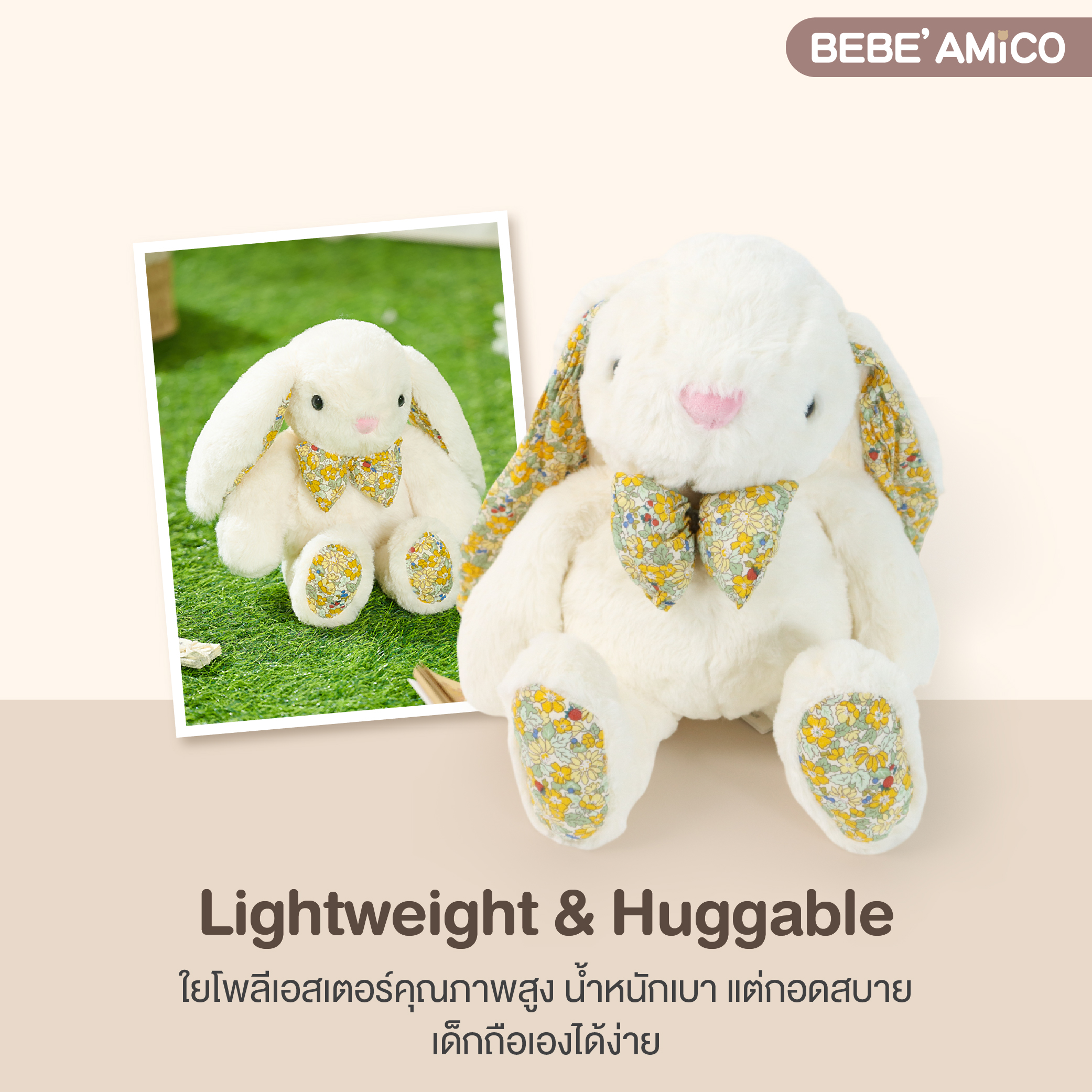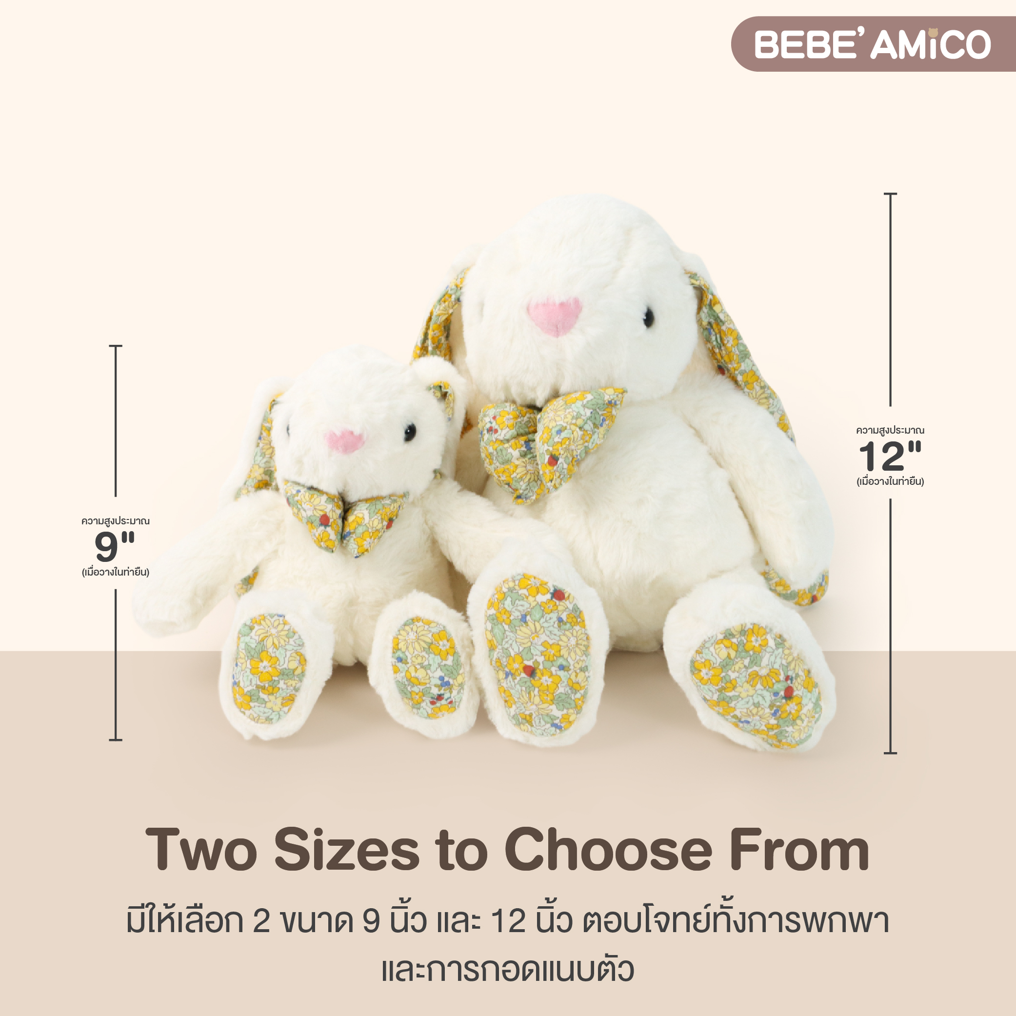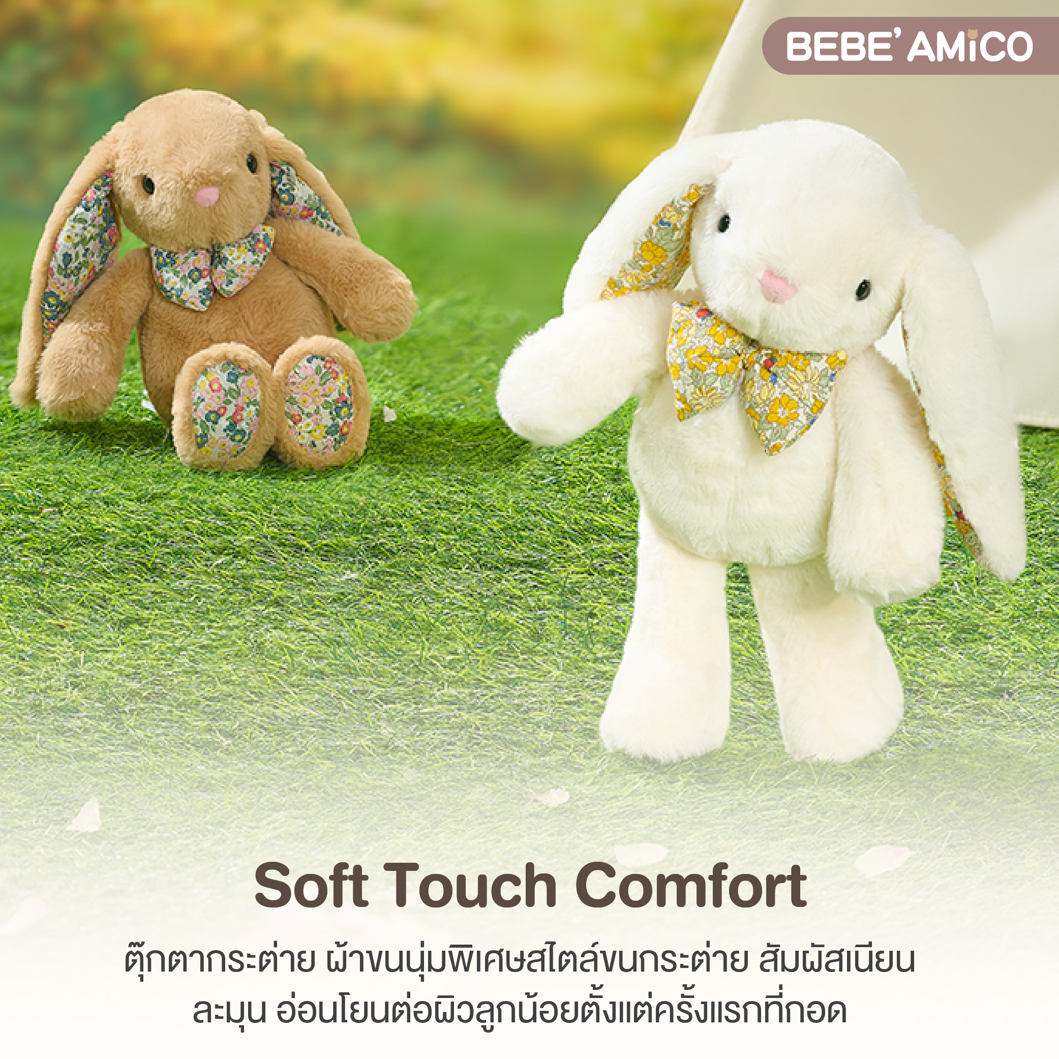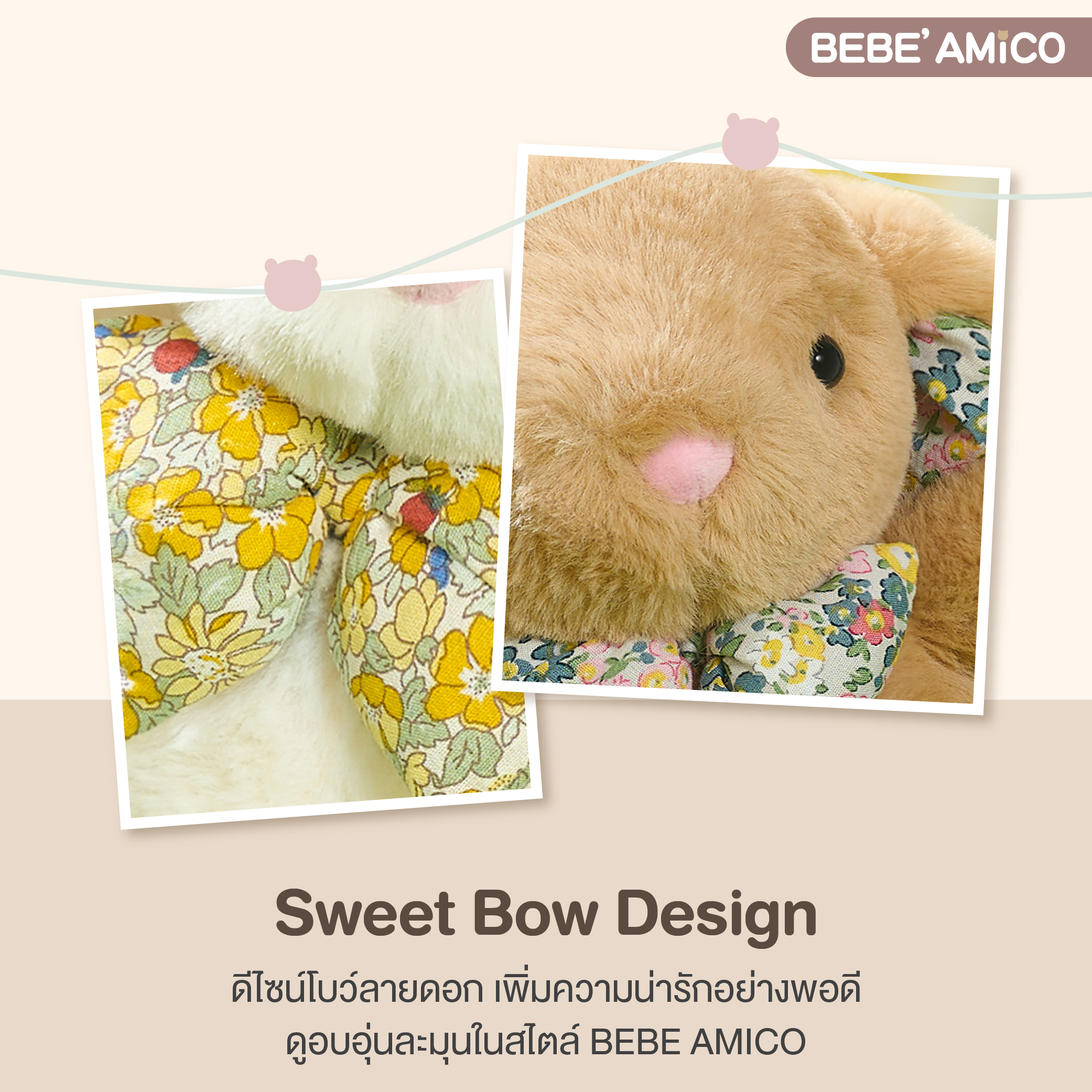 ผลิตจาก ผ้าขนนุ่มพิเศษสไตล์ขนกระต่าย ให้สัมผัสเนียน ละมุน อ่อนโยนต่อผิว พร้อมหูกระต่ายยาวนุ่มและดีไซน์โบว์ลายดอกสุดน่ารัก ขนาด 12 นิ้ว เหมาะสำหรับการกอดแนบตัว ให้ความรู้สึกอบอุ่นและปลอบประโลม