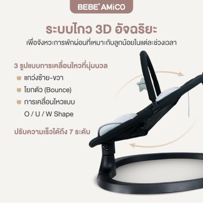 ระบบไกว 3D อัจฉริยะ: * มาพร้อม 3 รูปแบบการเคลื่อนไหวที่นุ่มนวล: ทั้งการแกว่งซ้าย-ขวา, การโยนตัว (Bounce) และการเคลื่อนที่แบบรูปทรง O, U และ W
