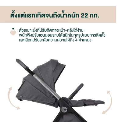 •รองรับตั้งแต่แรกเกิด: รถเข็น Bellagio รองรับการใช้งานตั้งแต่แรกเกิดจนถึงน้ำหนัก 22 กิโลกรัม ที่นั่งสามารถปรับเปลี่ยนทิศทางได้ง่าย พนักพิงปรับเอนได้เต็มที่ทั้งสองทิศทาง และสามารถปรับได้ 4 ระดับโดยใช้มือเดียว