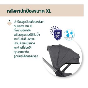 •หลังคาป้องกันแสงแดด XL: หลังคาที่สามารถยืดขยายได้พร้อมทั้งป้องกันแสงแดด UV50+ และทนทานต่อน้ำ มีหน้าต่างตาข่ายเพื่อให้พ่อแม่สามารถมองเห็นลูกได้ตลอดเวลา