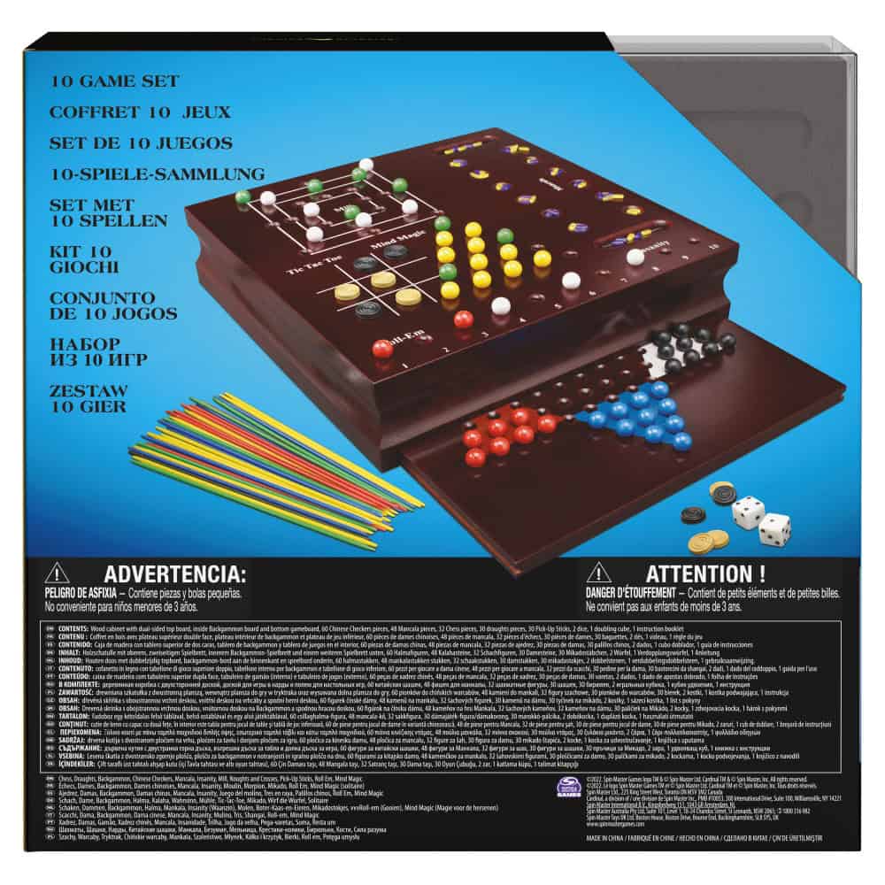 10 IN 1 GAME SET. 10 different boards in 1 strong and elegant wooden box. Enjoy the games of always and your favorites: Chess, Checkers, Backgammon, Chinese Checkers, Mancala, Insanity, Mill, Tic Tac Toe, Pick Up Sticks, Roll Em, Mind Magic. It contains all the accessories and instructions to share the games with family and friends.