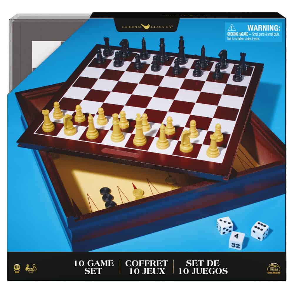 This Cardinal Family 10 Game Set will provide hours of fun. It includes chess, mancala, checkers, Chinese checkers, insanity, mill, tic tac toe, pick up sticks, mind magic and roll-em. All games in this Cardinal chess and checkers set are housed in a beautiful wooden cabinet that makes the collection a display piece as well. It has a dual-sided top board, and the wooden board game also includes instructions for each game.