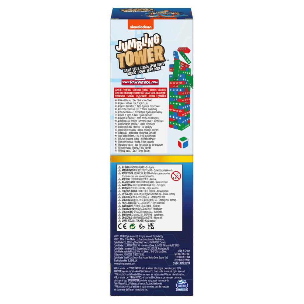 Sturdy colorful wood pieces are the perfect size for little hands Play alone or with friends A great gift for any Nickelodeon PAW Patrol fan PAW Patrol Jumbling Tower Game is for ages 4+ Includes: 48 wood pieces, 1 die, complete instructions