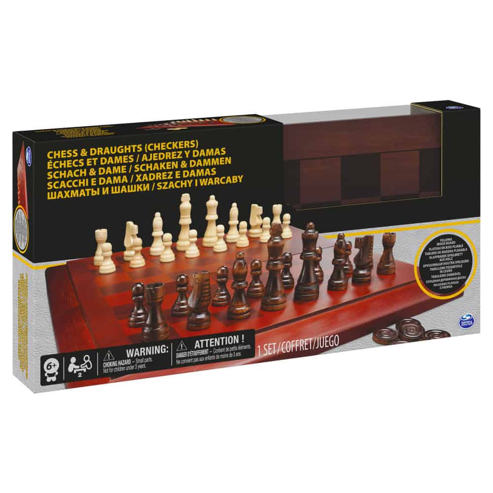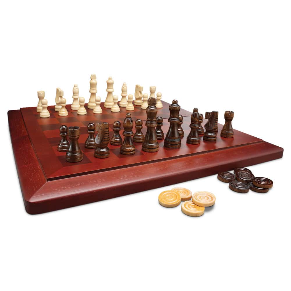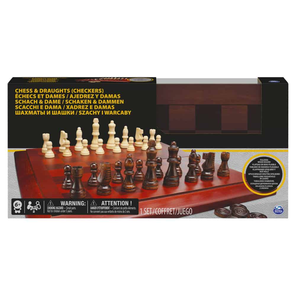 Includes 32 deluxe wood Staunton chess pieces, 24 deluxe wood checkers pieces, and a tournament size wood folding chess/checker board Ages 6+ Instructions included