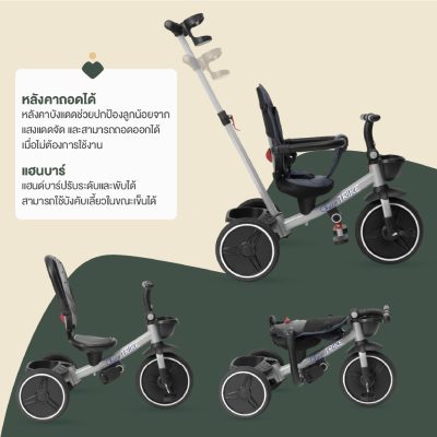 รถสามล้อเด็กแบบ 4 in 1 ที่ออกแบบมาให้ปรับเปลี่ยนการใช้งานได้ตามช่วงวัย ตั้งแต่โหมดเข็นควบคุมโดยผู้ปกครอง ไปจนถึงโหมดปั่นด้วยตัวเอง ช่วยเสริมพัฒนาการด้านการทรงตัว การประสานงานของกล้ามเนื้อ และการเคลื่อนไหวอย่างเป็นธรรมชาติ โครงสร้างแข็งแรง ปลอดภัย นั่งสบาย เหมาะสำหรับกิจกรรมกลางแจ้งและการใช้เวลาคุณภาพร่วมกันของครอบครัว