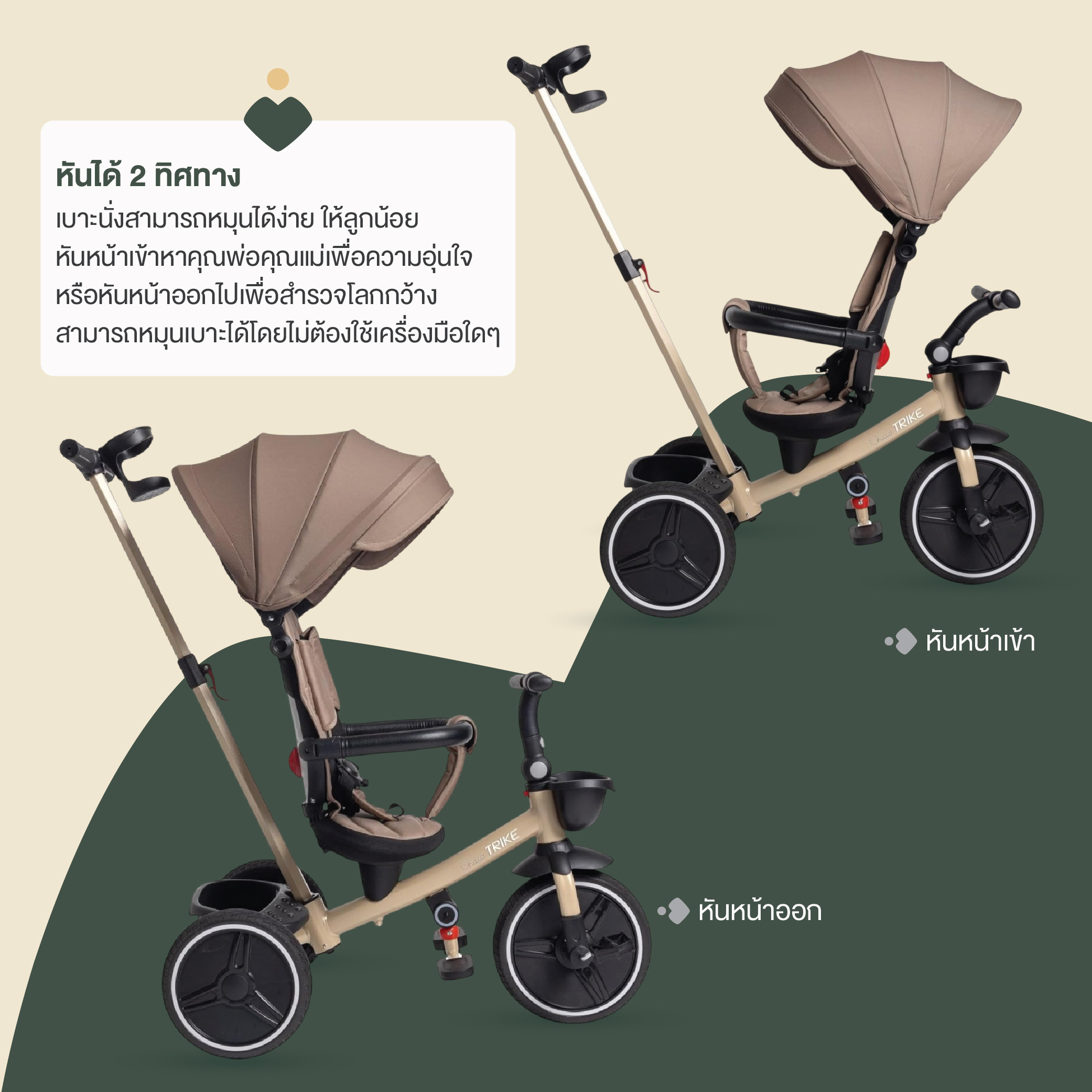 ✅Push Trike (9–12 เดือน) – ผู้ปกครองควบคุมจักรยานด้วยด้ามจับ พร้อมสายรัดและราวป้องกันที่นุ่มสบาย