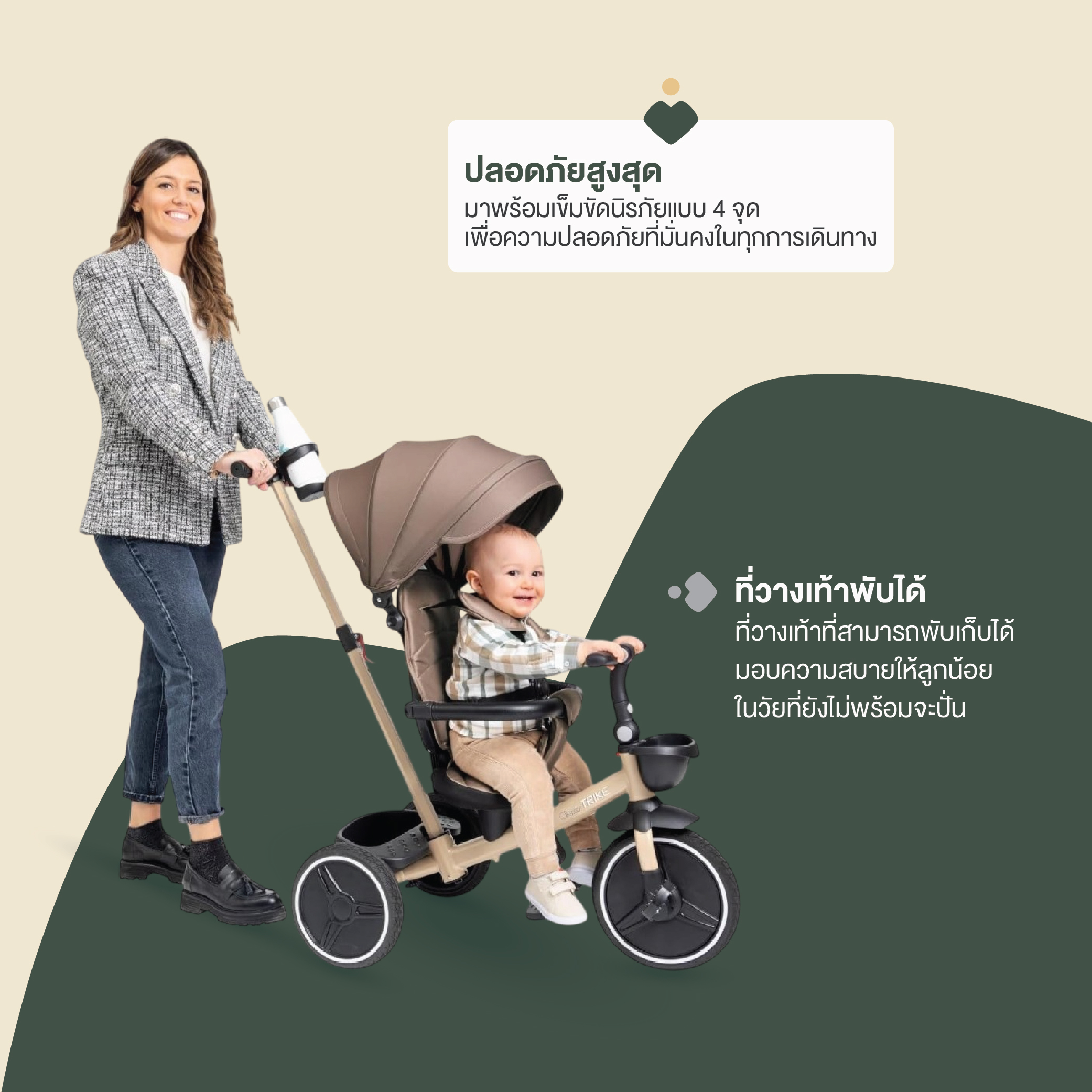 ➡️ ที่วางเท้าพับได้ – ใช้ในช่วง Push Trike เพื่อความสะดวกสบาย