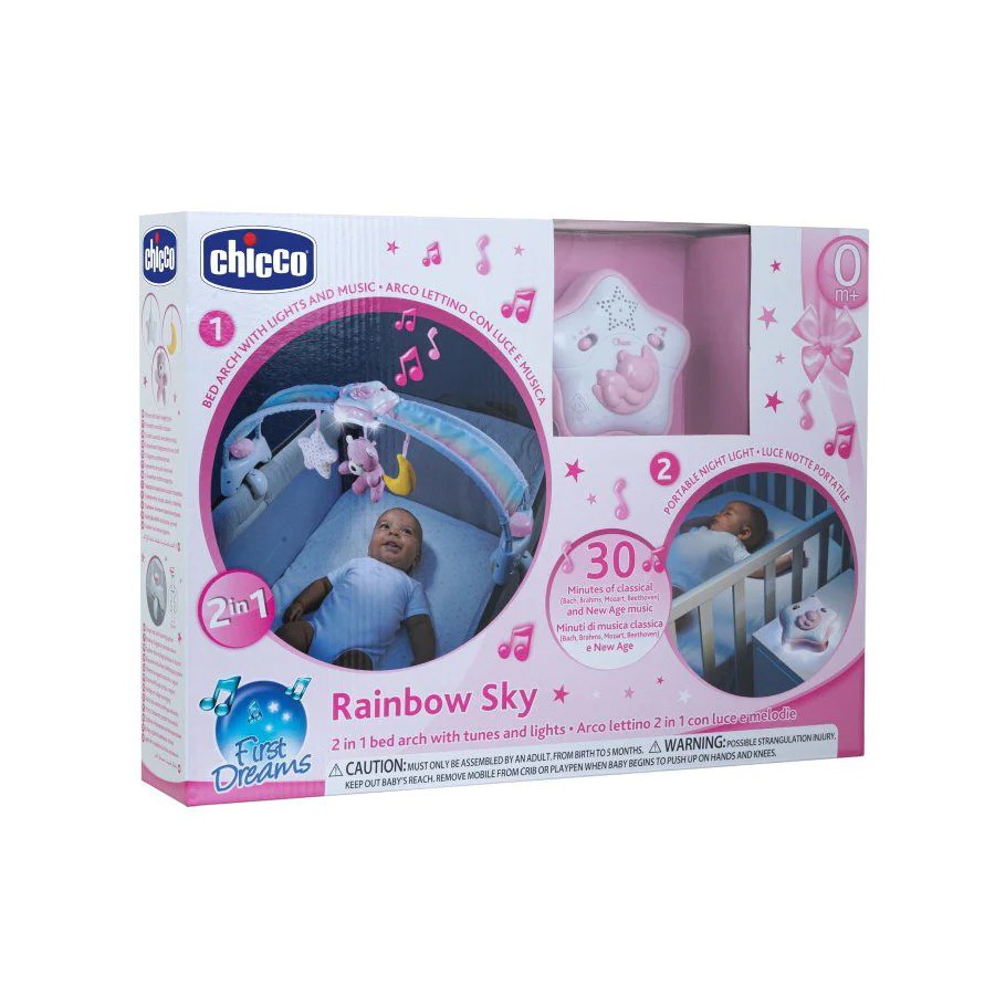 Chicco First Dreams 2-in-1 Rainbow Sky Bed Arch ได้ออกแบบมาเพื่อให้เวลานอนเป็นประสบการณ์ที่มหัศจรรย์สำหรับนักฝันตัวน้อยของคุณ