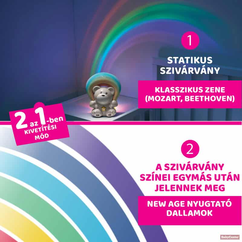 • LIGHT PROJECTOR WITH MUSIC: Chicco’s Rainbow Bear is the bear with 2 light projection modes and relaxing music. It creates a magical atmosphere in the room to help newborn babies fall asleep.• STATIONARY PROJECTION MODE: The Rainbow Bear projects a stationary rainbow light beam on the ceiling and walls of the room.• SEQUENCE PROJECTION MODE: The rainbow appears in sequence colour by colour, following the rhythm of the music.• CUSTOMISABLE: Thanks to the curved mirror on the back that rotates 360 °, you can adjust the width and direction of the projection according to the child’s room and desires.• RELAXING MUSIC: Rainbow Bear plays classical (Mozart and Beethoven) and New Age music in cycles of 15 and 30 minutes; the practical volume selector allows you to adapt it to the needs of the child.• KIDS AND NEWBORN TOYS: Discover all the Chicco toys, a world of fun with a wide selection of toys for babies and children and gifts for girls and boys.