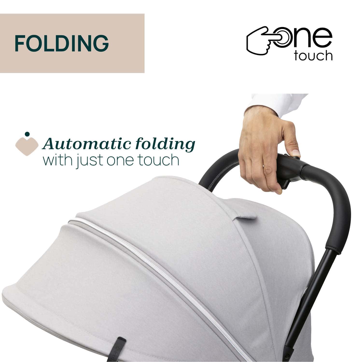• รถเข็นเด็กพับเก็บง่ายอัตโนมัติด้วยมือเดียว เพียงสไลด์แล้วกดปุ่มตรงด้ามจับ จะพับเก็บ และสามารถตั้งได้ด้วยตัวเอง