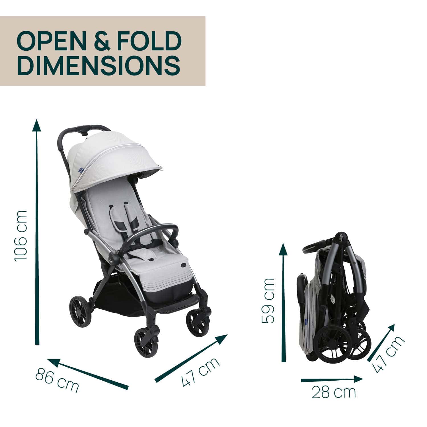 No more need for the pushchair? With a simple push, the pushchair folds itself. Once folded, the pram stands upright on its own and is extremely compact.
