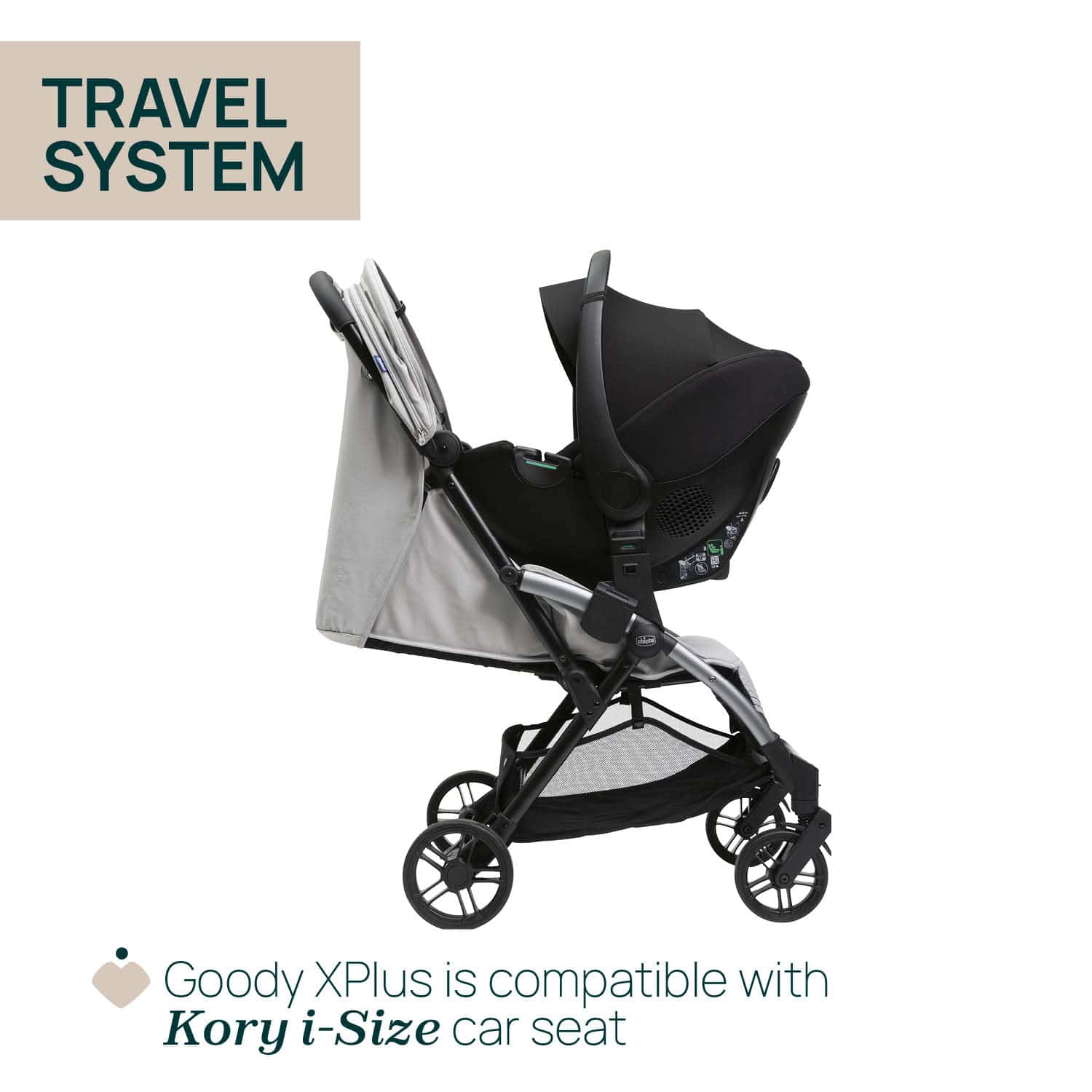 The wide, padded seat is fully reclinable, and is approved from birth to 22 kg. The seat is wide and well padded for a very comfortable fit. Padded shoulder straps and crotch included. Extendable XXL canopy with UV50+ protection and water-resistant treatment. The mesh window at the top keeps you in visual contact with your baby. Goody XPlus can easily be converted into a travel system with the Kory i-Size car seat. Adapters are sold separately. Goody XPlus ensures the best manoeuvrability on all surfaces and to win every road thanks to the large wheels fully accessorised: shock absorbers and ball bearings on all wheels. The front wheels can be used as either fixed or swivel wheels, and the swivel system also includes ball bearings.