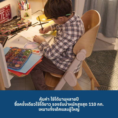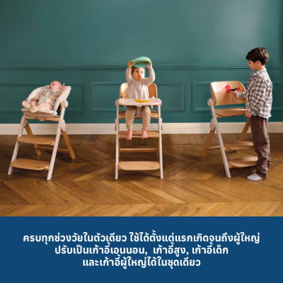 ด้วยการออกแบบที่เป็นโมดูลาร์และอุปกรณ์เสริมที่รวมมาให้ คุณสามารถเปลี่ยนเก้าอี้สูงได้อย่างง่ายดาย โดยไม่ต้องใช้เครื่องมือ การเปลี่ยนรูปแบบของเก้าอี้ทำได้ด้วยการเคลื่อนไหวที่เรียบง่ายเพียงครั้งเดียว ที่นั่งและที่เหยียบที่ปรับได้ จะเติบโตไปพร้อมกับการเจริญเติบโตของลูกน้อย ทำให้มั่นใจได้ว่าท่าทางในการรับประทานอาหารจะอยู่ใน ท่า 90 องศา ที่เหมาะสมที่สุดเสมอ เพื่อช่วยในการย่อยอาหารได้ดียิ่งขึ้น