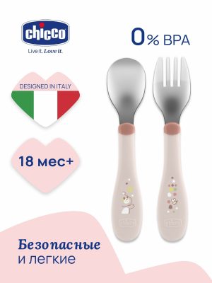 CHICCO METAL CUTLERY ชุดช้อนส้อมฝึกทานอาหารด้วยตัวเองเด็ก 18 เดือนขึ้นไป BPA-Free สีชมพู ดีไซน์น่ารัก แข็งแรง ใช้งานง่าย