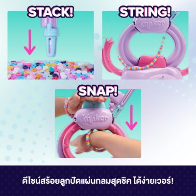ใช้ปากกาหยิบลูกปัดตามแพตเทิร์นที่ต้องการ แล้วดูดีไซน์ค่อยๆ เรียงซ้อนอยู่ภายในปากกา จากนั้นปล่อยลูกปัดลงในตัวเครื่องให้ร้อยลงบนเส้นยาง สอดข้อมือผ่านตัวเครื่องแล้วกดปุ่ม กำไลจะประกบล็อกเข้าด้วยกันอย่างน่าอัศจรรย์ เครื่องทำกำไล Cool Maker นี้จะช่วยจุดประกายจินตนาการ ให้เด็กๆ ออกแบบกำไลซ้อนในสไตล์ของตัวเอง หรือทำตามคู่มือดีไซน์ที่ให้มา จากนั้นซ้อนกำไล สวมใส่ และแบ่งปันกับเพื่อนซี้
