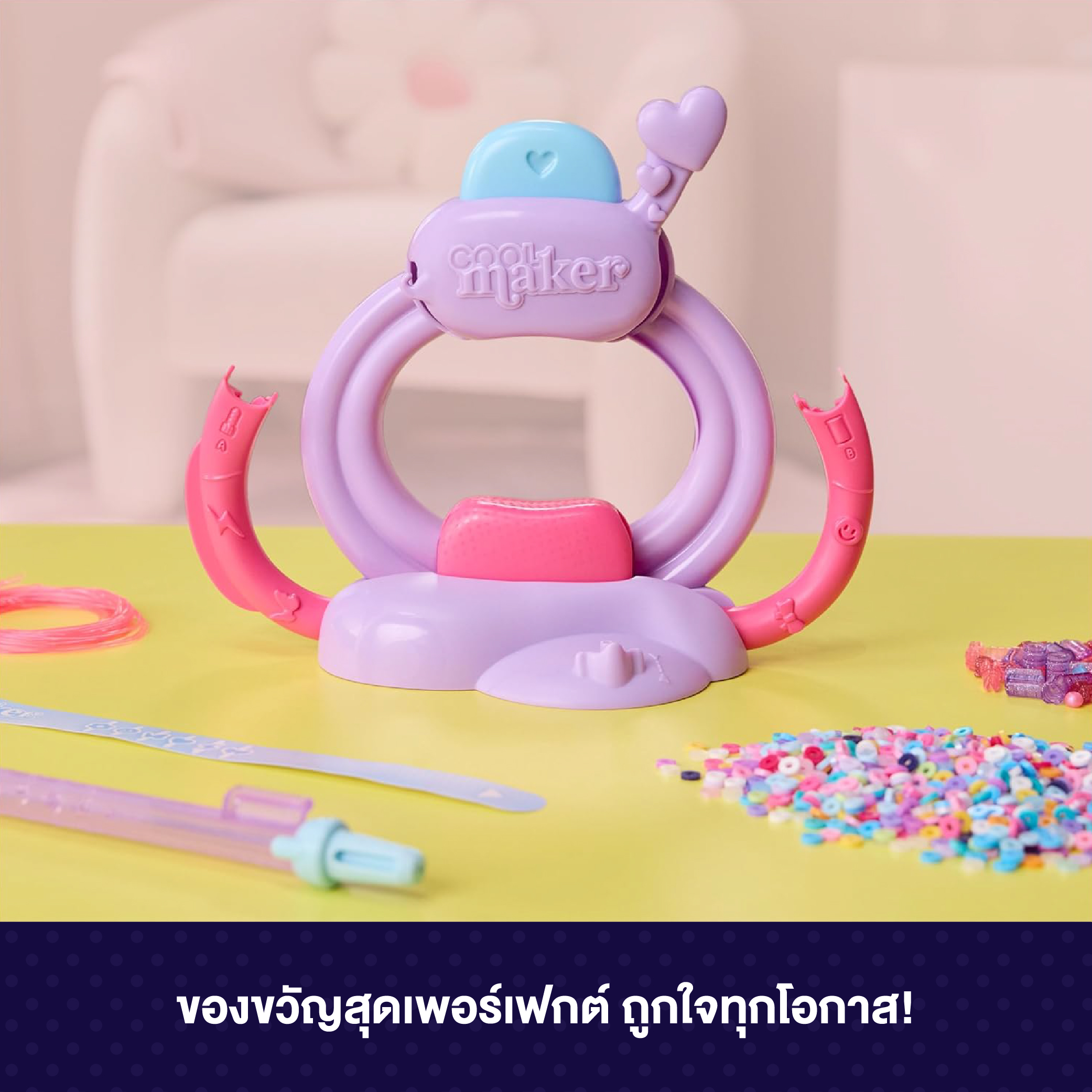 ใช้ปากกาหยิบลูกปัดตามแพตเทิร์นที่ต้องการ แล้วดูดีไซน์ค่อยๆ เรียงซ้อนอยู่ภายในปากกา จากนั้นปล่อยลูกปัดลงในตัวเครื่องให้ร้อยลงบนเส้นยาง สอดข้อมือผ่านตัวเครื่องแล้วกดปุ่ม กำไลจะประกบล็อกเข้าด้วยกันอย่างน่าอัศจรรย์ เครื่องทำกำไล Cool Maker นี้จะช่วยจุดประกายจินตนาการ ให้เด็กๆ ออกแบบกำไลซ้อนในสไตล์ของตัวเอง หรือทำตามคู่มือดีไซน์ที่ให้มา จากนั้นซ้อนกำไล สวมใส่ และแบ่งปันกับเพื่อนซี้