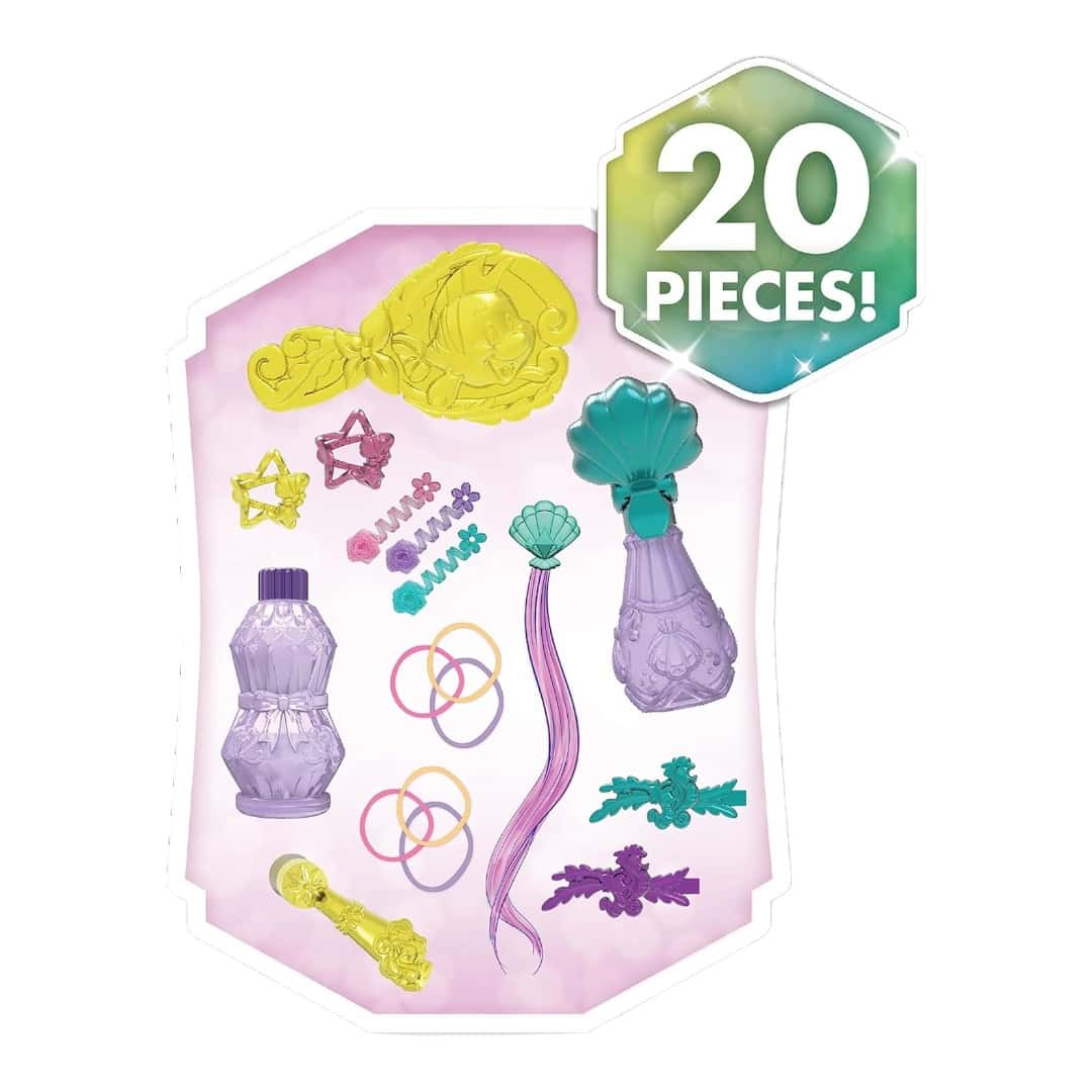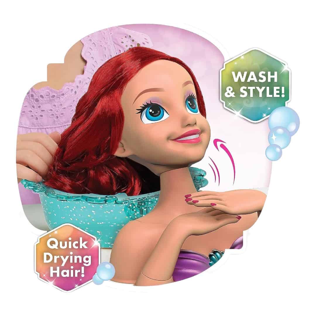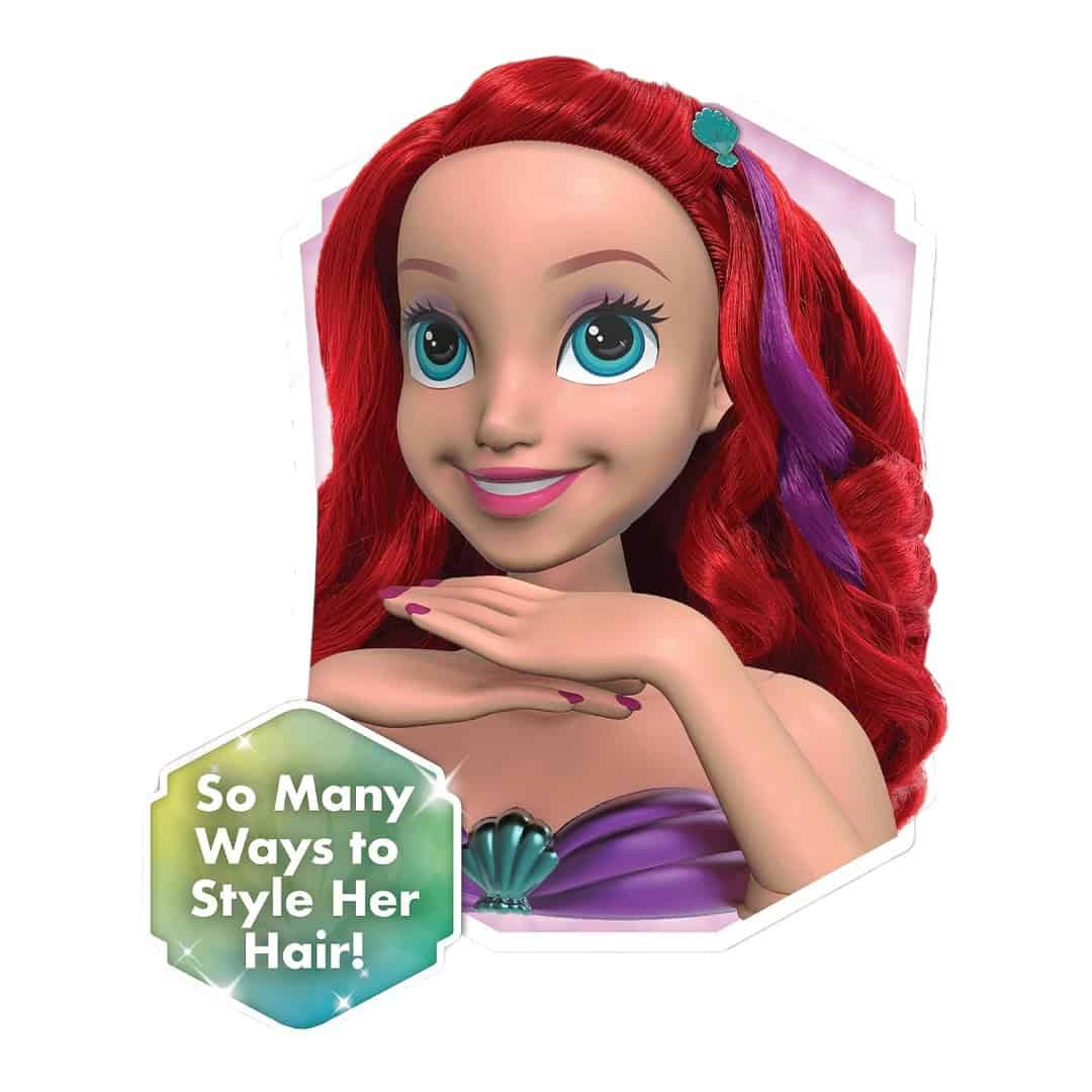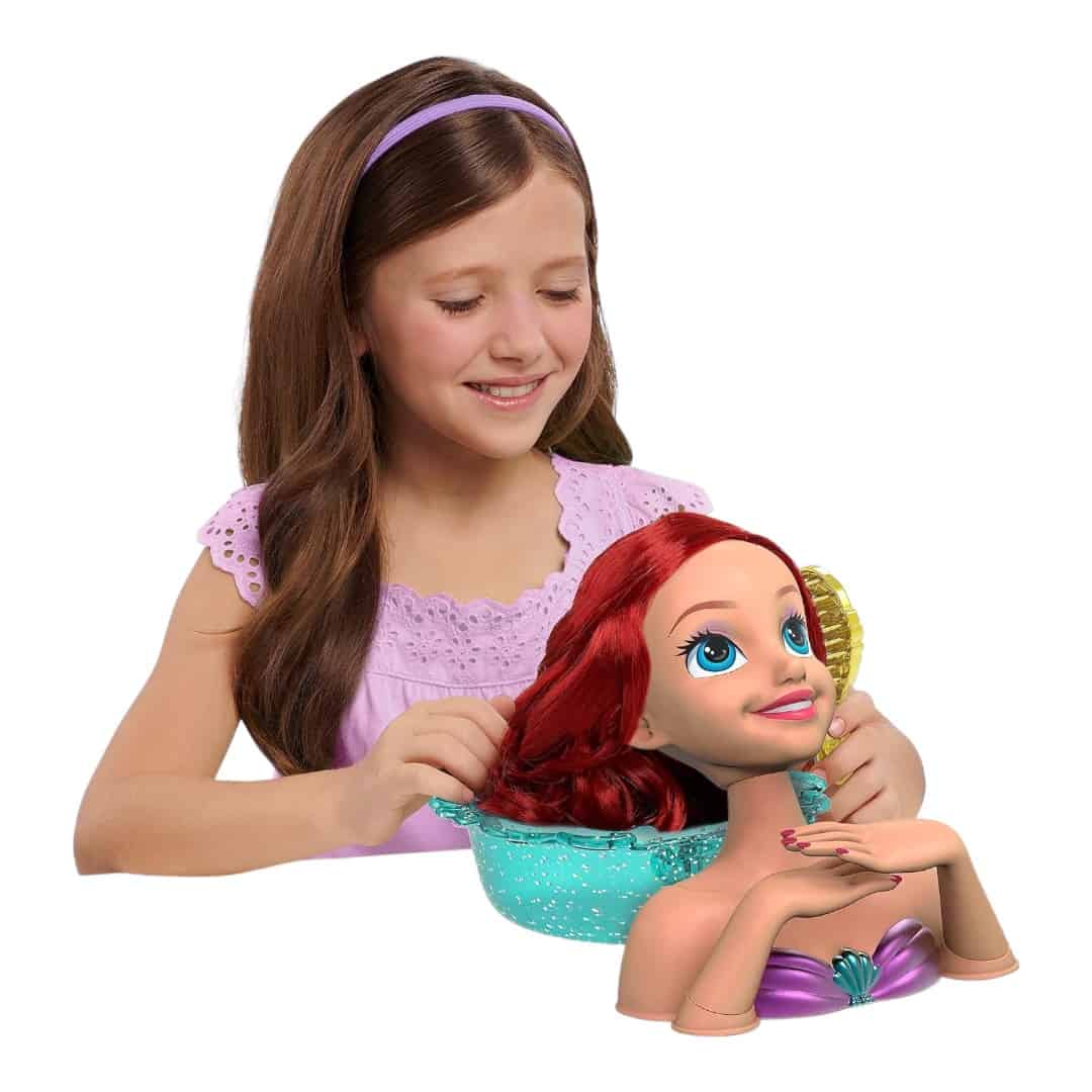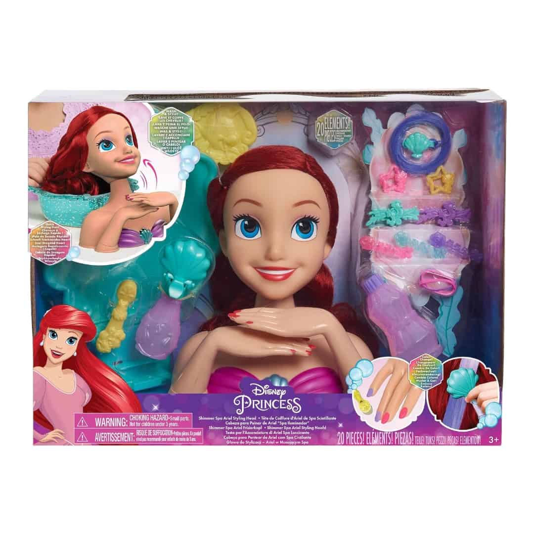 20-Piece Styling Head Set: The Disney Princess Shimmer Spa Ariel Styling Head lets preschoolers dress up and pretend play at being stylists. Brush and style Ariel’s hair into beautiful new looks and give her a manicure!