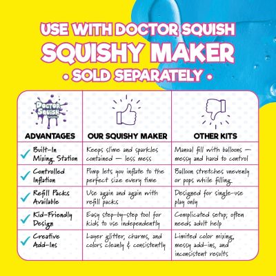 DIY SQUISHY FUN: Designed for use with the Doctor Squish squishy maker, this refill set lets kids keep creating. Make your own squishies of different sizes, decorate them with sparkles or confetti, and enjoy unlimited fun.