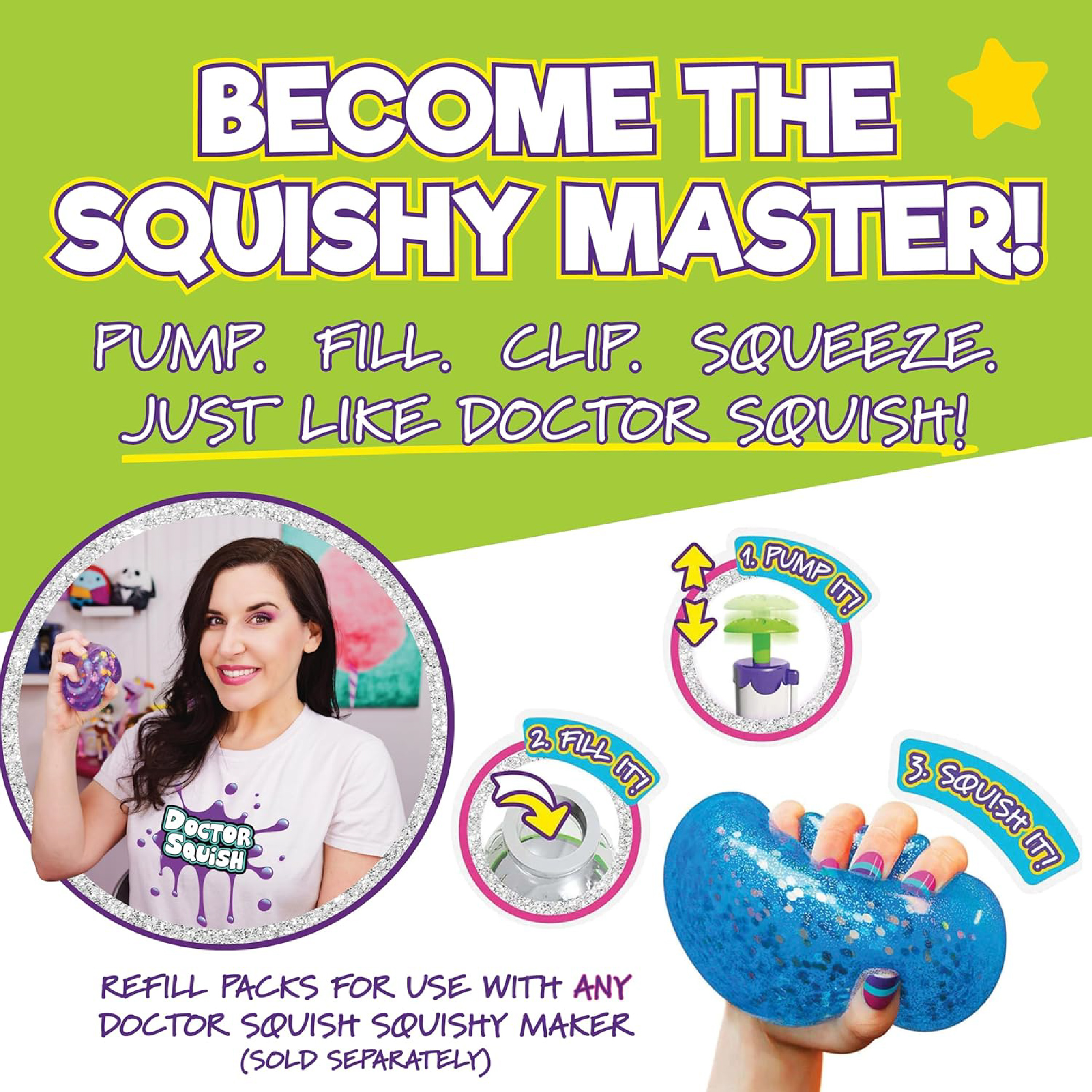 DIY SQUISHY FUN: Designed for use with the Doctor Squish squishy maker, this refill set lets kids keep creating. Make your own squishies of different sizes, decorate them with sparkles or confetti, and enjoy unlimited fun.