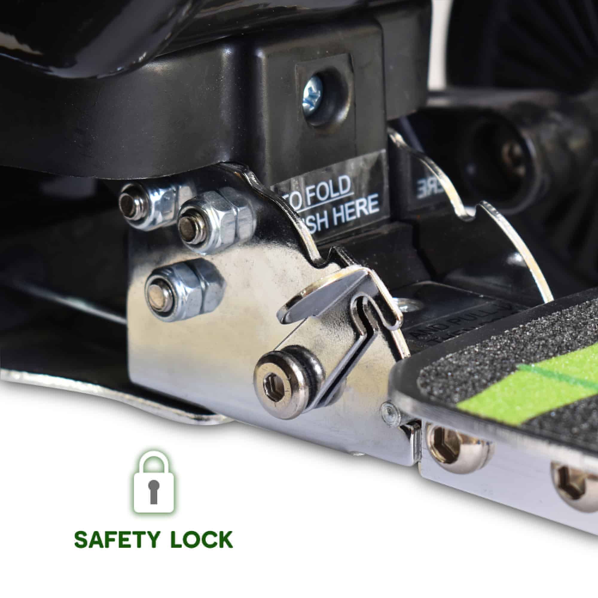 • Secure, integrated deck – scooter folds away and locks in place