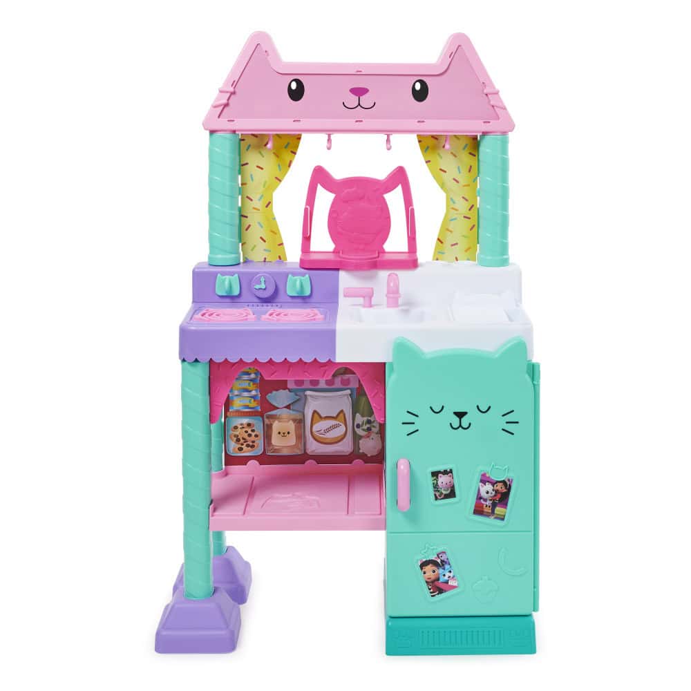 REALISTIC APPLIANCES: Stands over 3’ feet tall, with a stove, a sink with a dish rack, 10 kitchen accessories, 9 play food pieces and even a toy refrigerator, with photos of Gabby and her kitties!