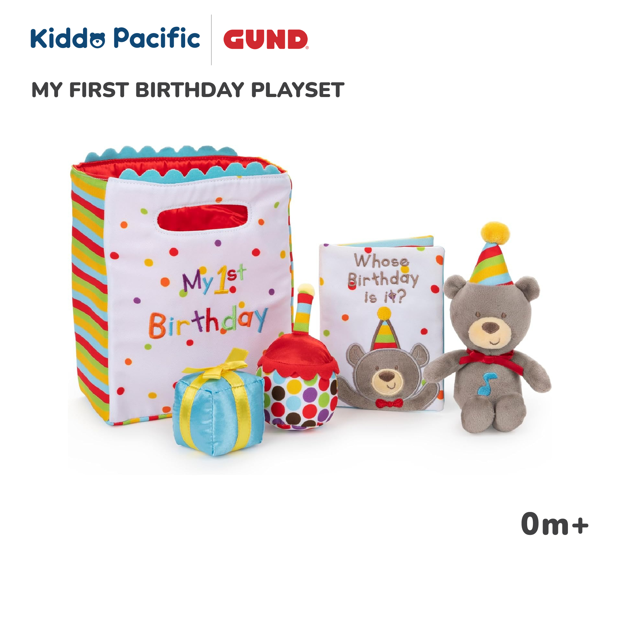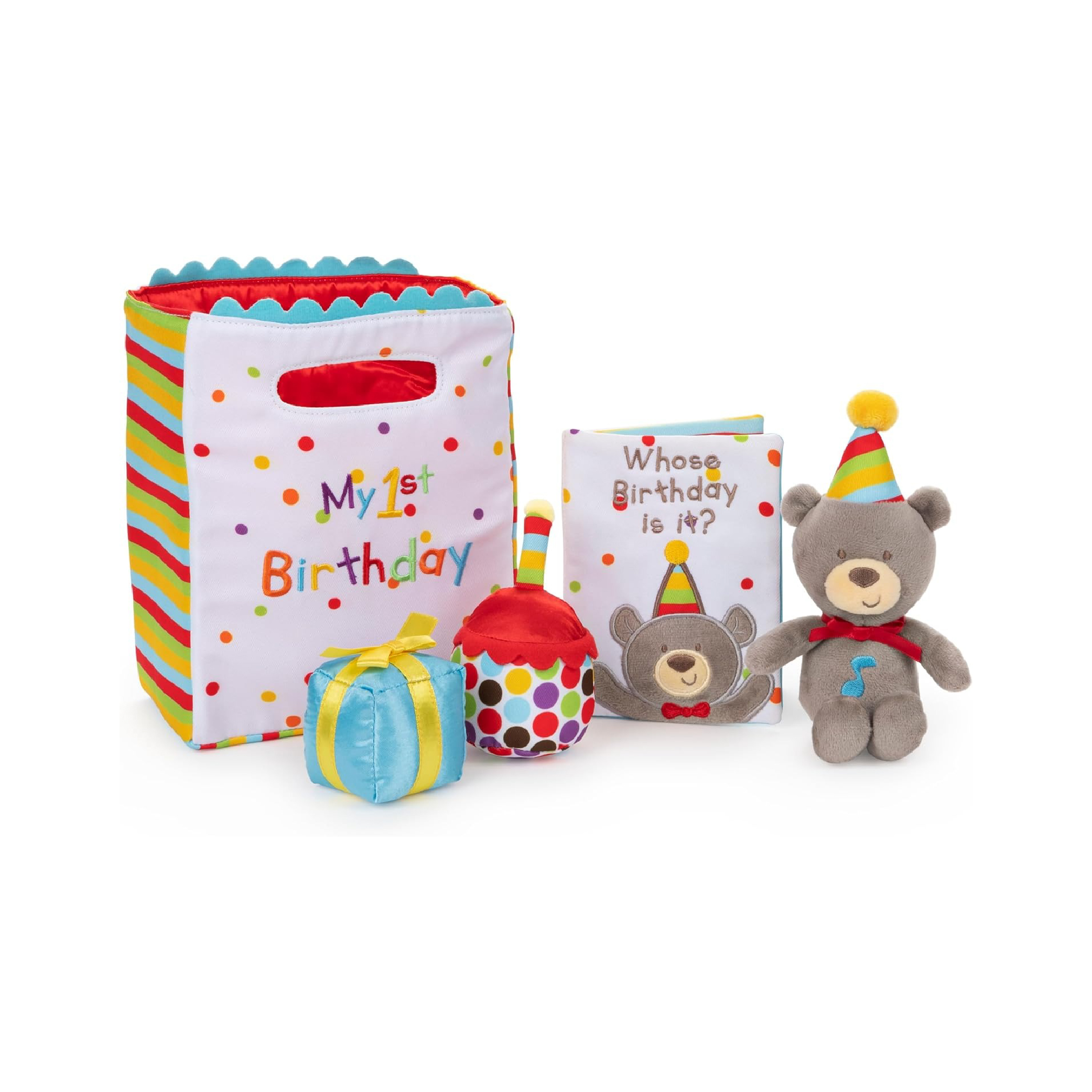 Celebrate first birthdays with a surprise gift bag they can open over and over again. This five-piece plush playset includes singing birthday bear, rattle gift, squeaker cupcake, mirror card, and birthday bag carrying case with touch and close fastener fo