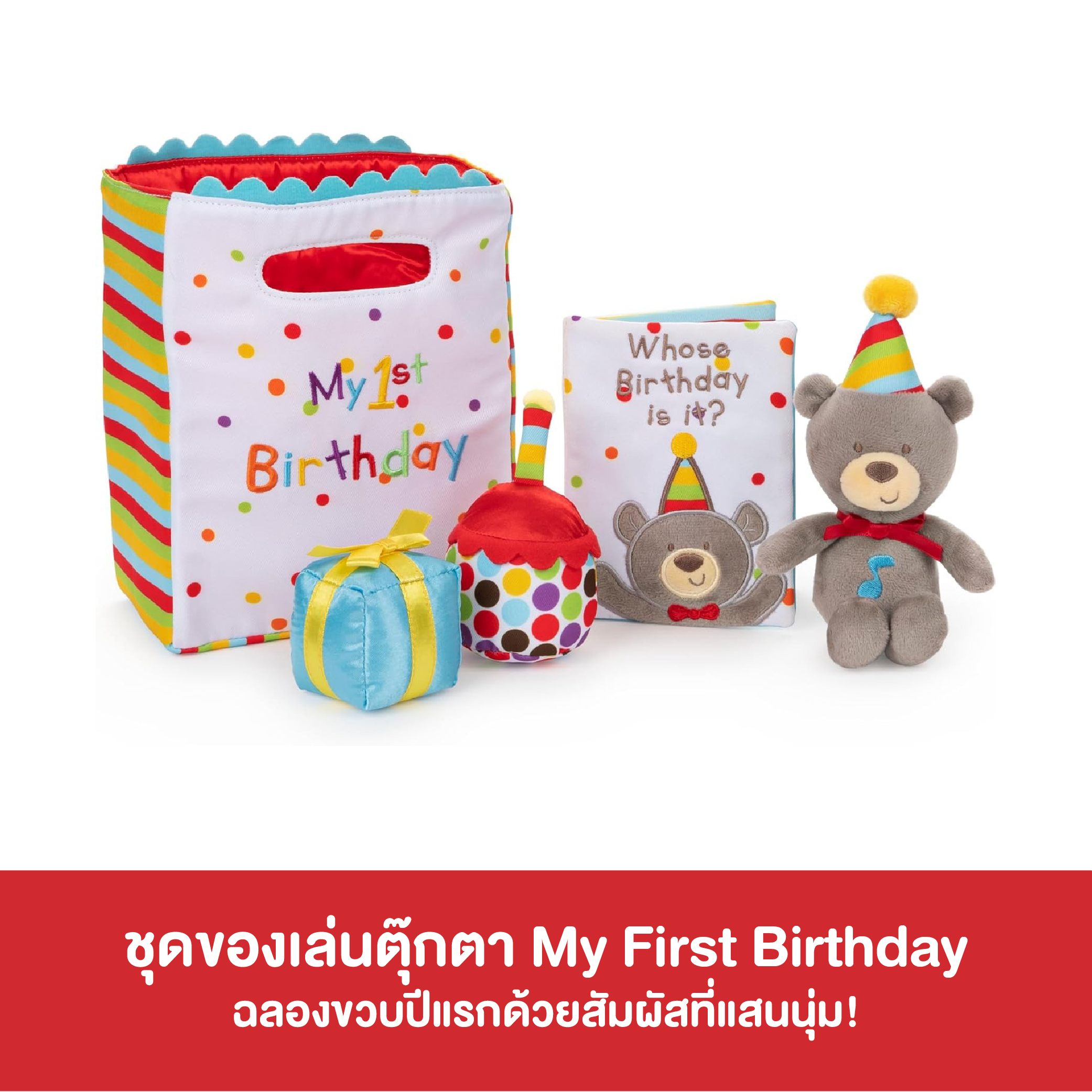 Happy birthday, baby! Celebrate the big milestone first birthday with a surprise gift bag they can open over and over again. This five-piece plush playset includes singing birthday bear, rattle gift, squeaker cupcake, mirror card, and birthday bag carrying case with touch and close fastener for secure toting and storage. Adorably safe and soft colorful embroidery make this sensory stimulating playset the perfect gift for any little ones turning one! Excluding sound toy, playset is machine washable for easy cleaning and appropriate for all ages.