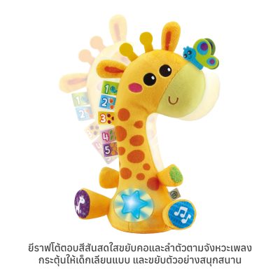 การเรียนรู้สีและรูปทรง: มี ปุ่มรูปทรงที่มีสีสันห้าปุ่ม บนลำตัว เมื่อกด ยีราฟจะบอก ชื่อสีและรูปทรง ในขณะที่คอของมัน สว่างขึ้น ด้วยสีนั้น เสริมสร้างการเรียนรู้ทางสายตา