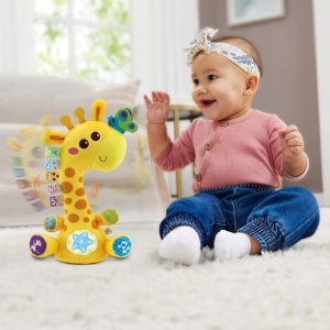 Color and Shape Learning: Features five colorful shape buttons on its body. When pressed, the giraffe names the color and shape while its neck lights up with that color, reinforcing visual learning.
