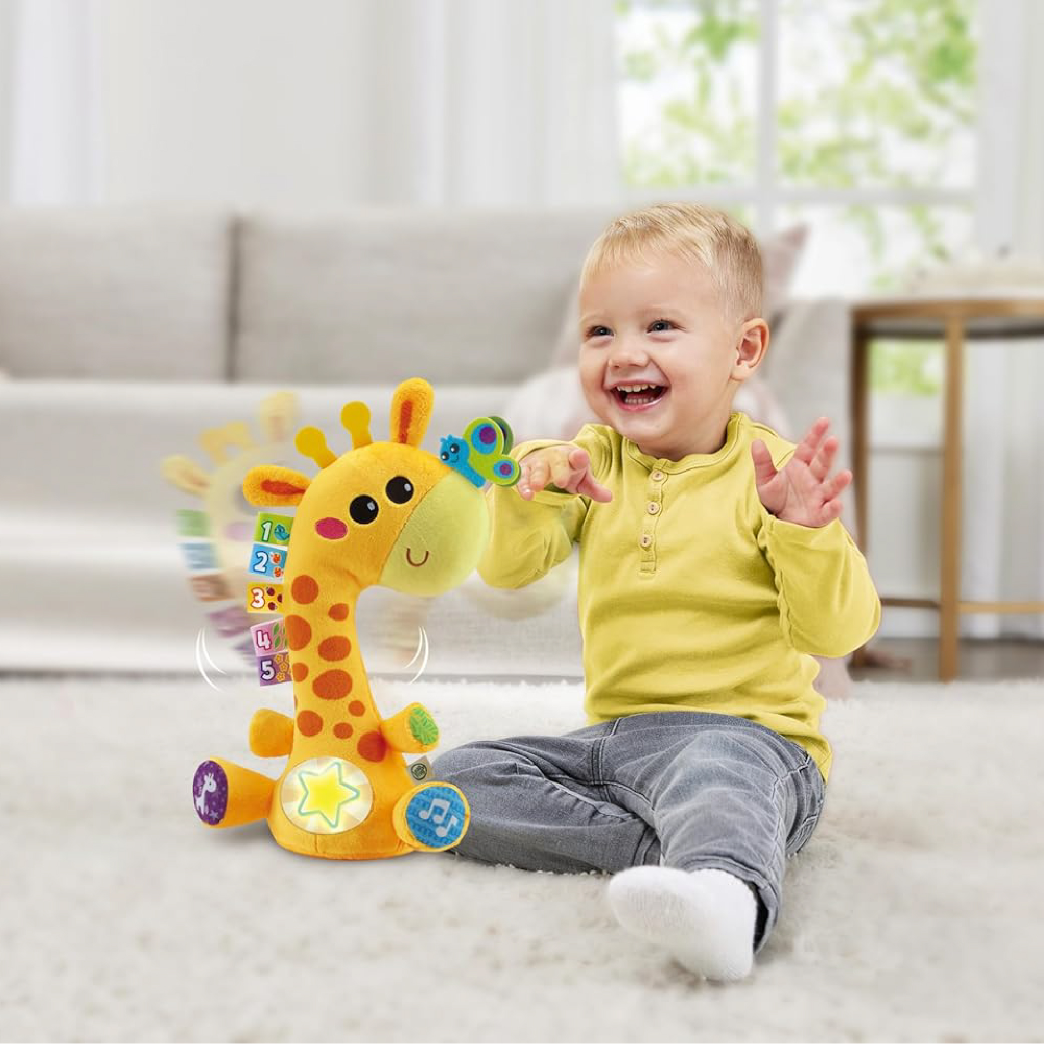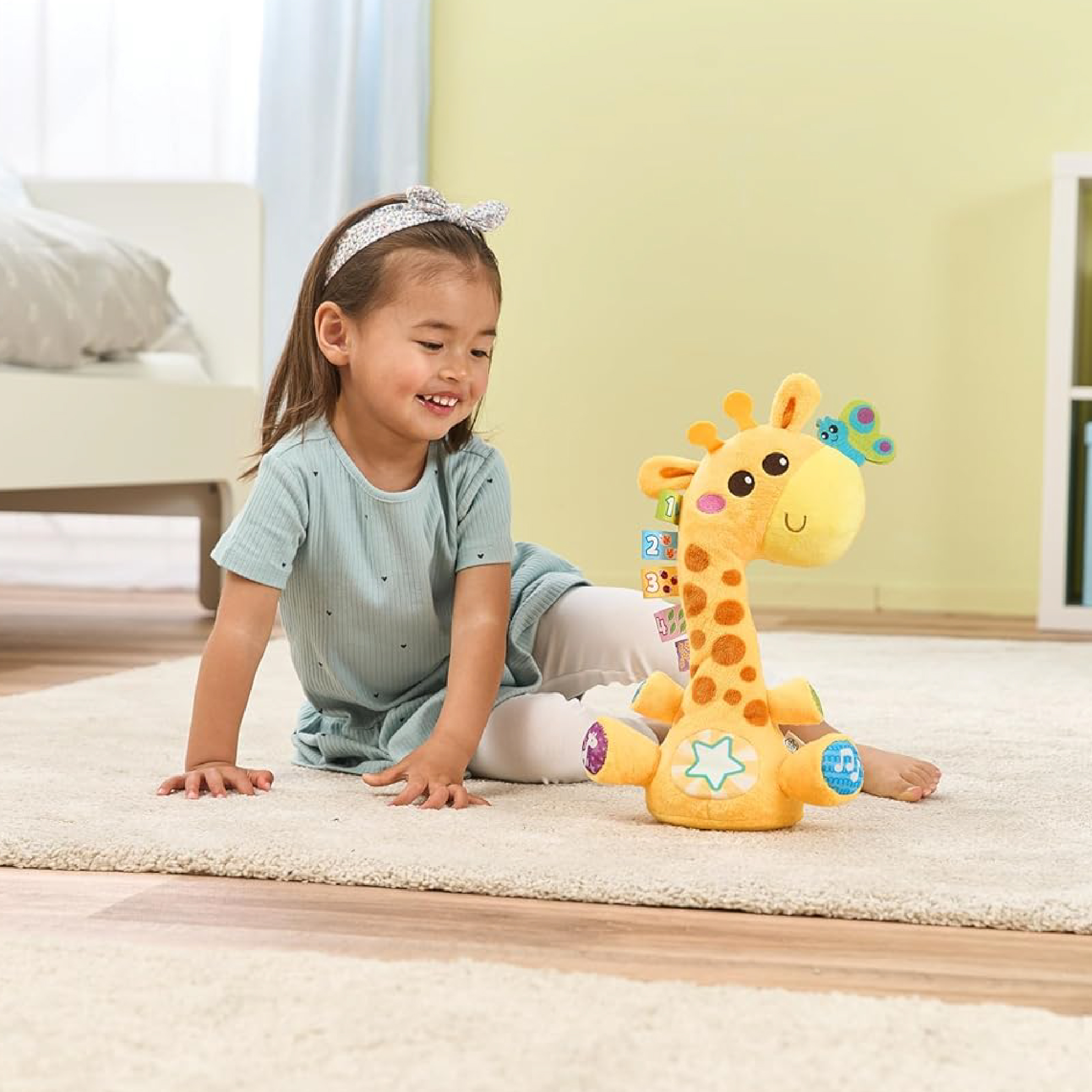 Color and Shape Learning: Features five colorful shape buttons on its body. When pressed, the giraffe names the color and shape while its neck lights up with that color, reinforcing visual learning.