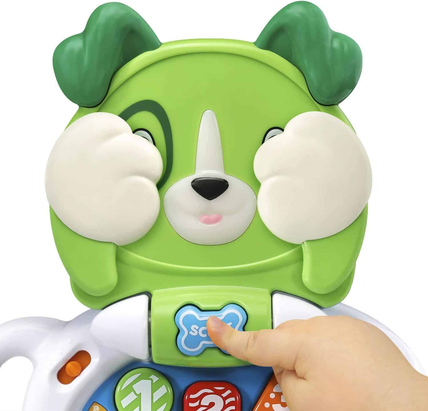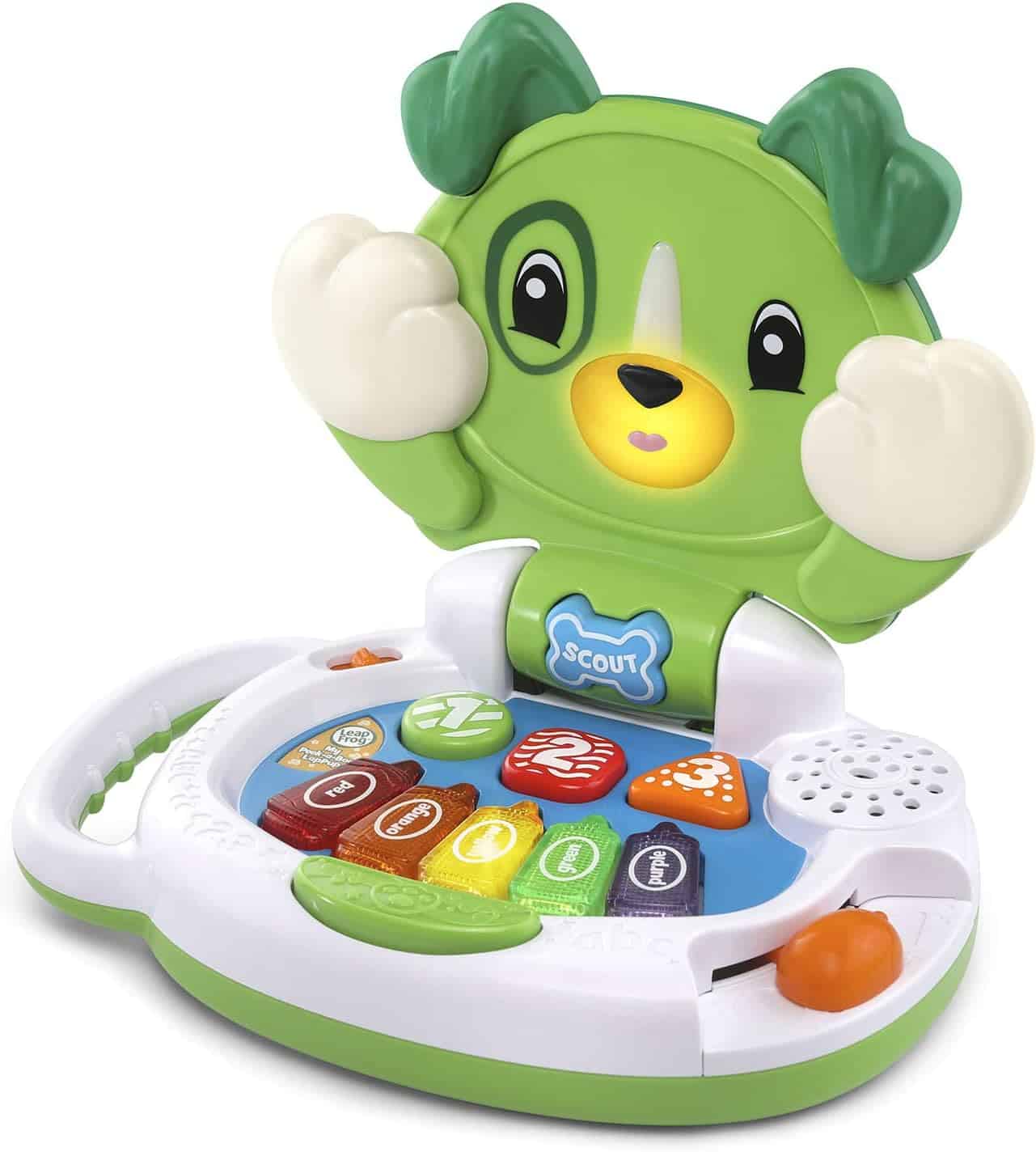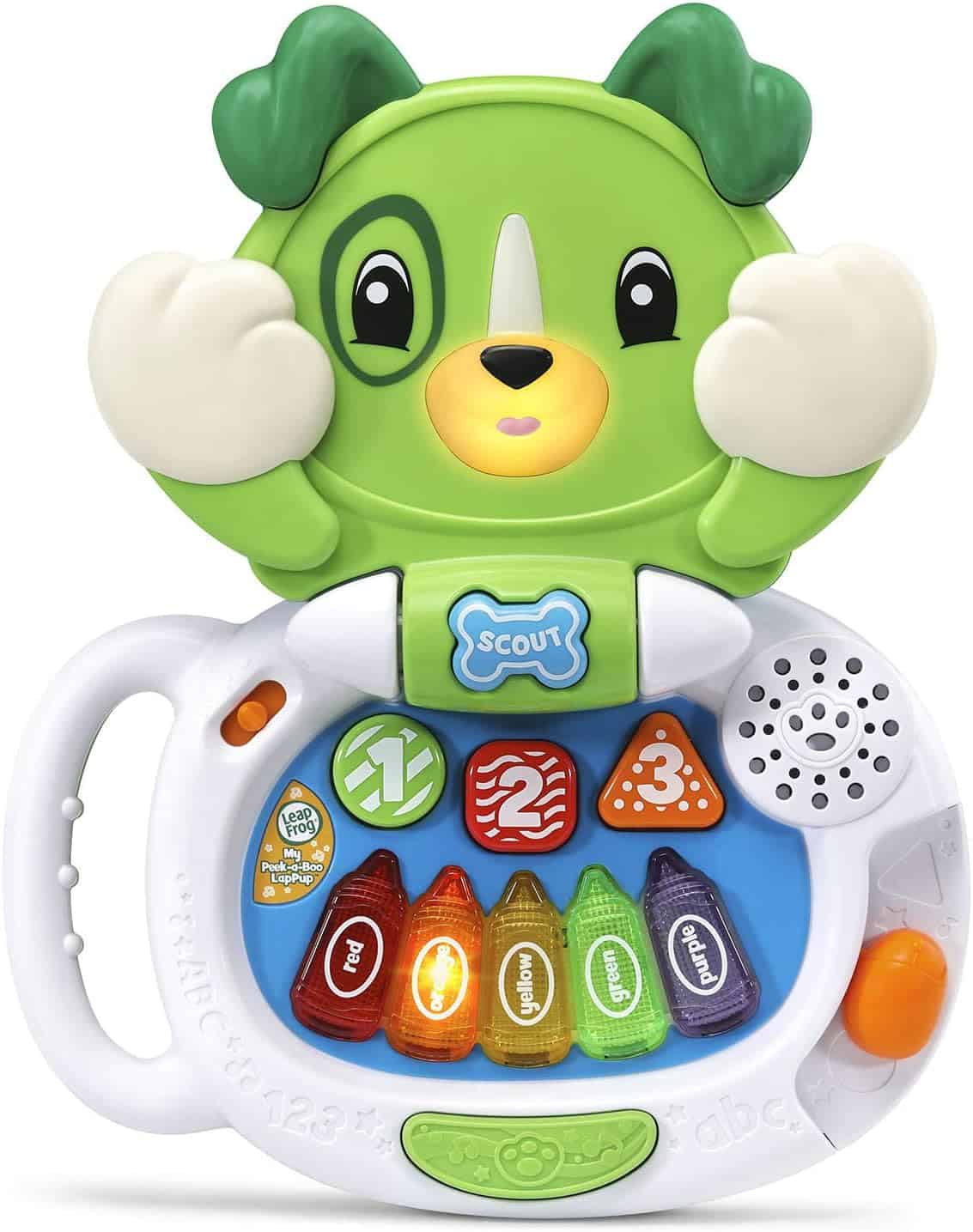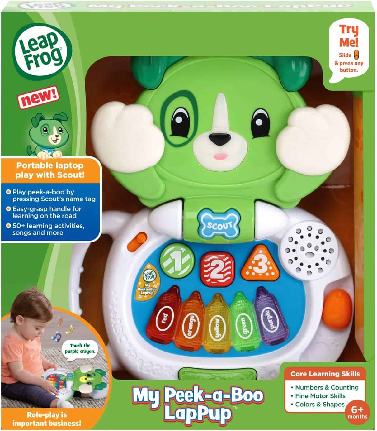 • Open and close the laptop to learn about opposites, rhymes, shapes, colors and numbers. Scout’s mouth lights up as he talks• Play a silly game of peek-a-boo by pressing Scout’s name tag button. Scout will cover his eyes and say cute peek-a-boo phrases