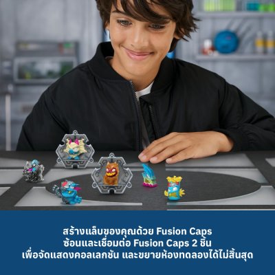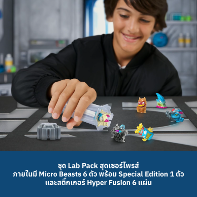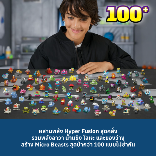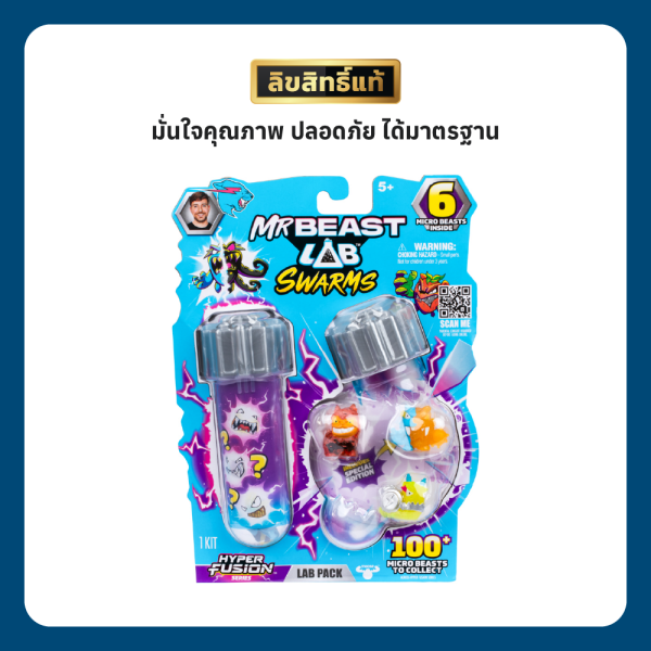 MrBeast Lab ฝูงถูก ‘Hyper Fused’ เพื่อสร้างการผสมผสานที่บ้าคลั่งที่สุดจนถึงตอนนี้ โดยมีการผสมแบบบ้าคลั่งของลาวา น้ำแข็ง โลหะ และแม้แต่ของว่าง ทั้งหมดสร้างความโกลาหลในห้องทดลองและรอให้ค้นพบ! มีฝูง Hyper Fusion ขนาด 1 นิ้ว (2.5 ซม.) ที่มหากาพย์และไม่ซ้ำกันกว่า 100 ตัวให้สะสม รวมถึง: หายาก หายากมาก รุ่นพิเศษ และที่ต้องการมากที่สุด Limited Edition Hyper Fusion Panther ซึ่งได้ถูกผสมเข้าด้วยกันกับ 3 ธาตุต่างกัน! แต่รีบหน่อย มี Hyper Fusion Panther เพียง 1,000 ตัวเท่านั้นในซีรีส์ใหม่ MrBeast Lab! สิ่งใหม่ในซีรีส์ Hyper Fusion คือสติกเกอร์ EPIC Hyper Fusion! แต่ละ Lab Pack มาพร้อมกับสติกเกอร์ฝูงที่ไม่ซ้ำกัน 6 ชิ้นเพื่อวางในคู่มือสะสม ลูกของคุณจะสะสมสติกเกอร์ทั้งหมดเพื่อทำคอลเลกชันให้ครบหรือไม่? Lab Pack มี Mystery Micro Beasts 6 ตัว รวมถึง Special Edition 1 ตัวภายใน และสติกเกอร์ Hyper Fusion 6 ชิ้น! นอกจากนี้ Fusion Caps ยังถูกนำเข้ามาในซีรีส์ Hyper Fusion เด็ก ๆ สามารถวางซ้อนและเชื่อมต่อฝาครอบเพื่อจัดแสดงคอลเลกชันของพวกเขาและสร้าง MrBeast Lab ของตัวเอง! Lab Pack มี Fusion Caps 2 ชิ้น แต่สามารถขยายการจัดแสดงโดยซื้อแพ็ค MrBeast Swarms เพิ่มเติม ขยายความโกลาหล Hyper Fusion ด้วยความสามารถใหม่ทั้งหมดในการสร้างและจัดแสดงคอลเลกชัน MrBeast Lab Hyper Fusion ของคุณวันนี้! และอย่าลืมติดตามทุกความสนุกของฝูงบน YouTube กับการเปิดตัวเนื้อหาแอนิเมชันใหม่ทั้งหมดของ MrBeast Lab และดูฝูงสร้างความปั่นป่วนออนไลน์!