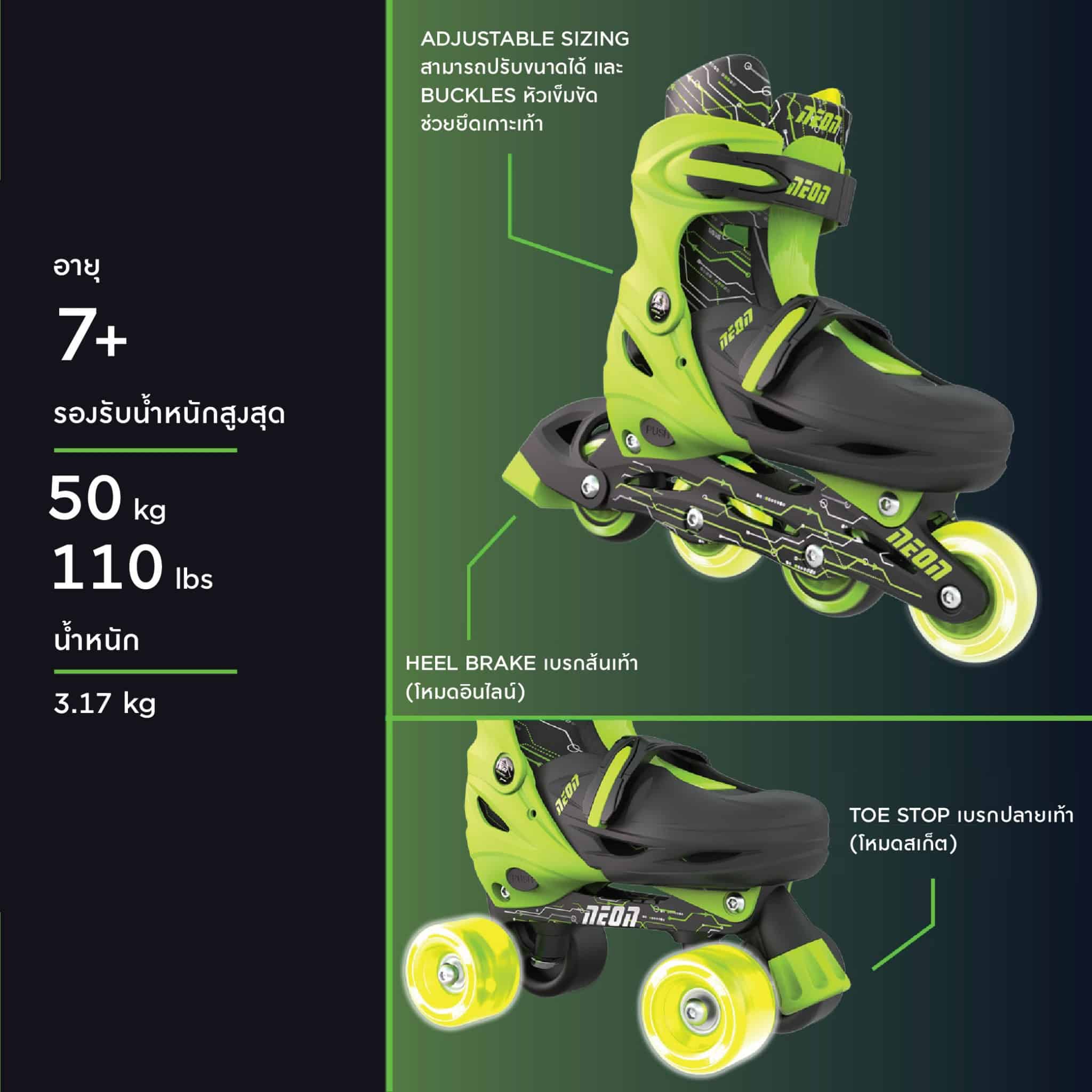 - Neon Combo Skates Size 3 – 6 จะเหมาะสำหรับเด็กอายุตั้งแต่ 7 – 10 ปี