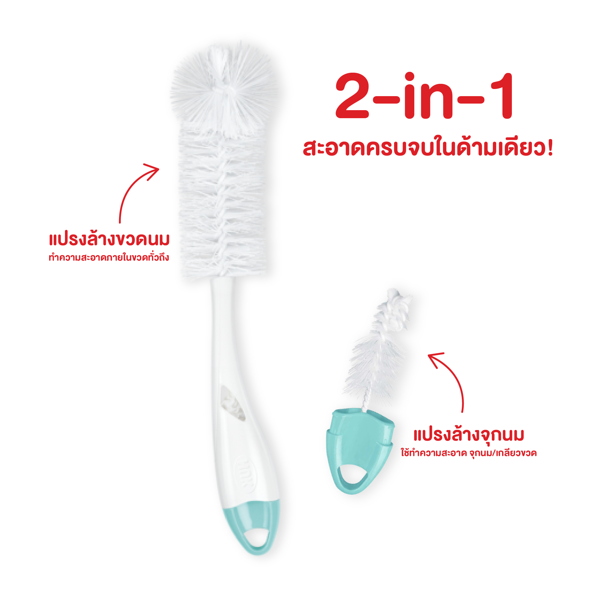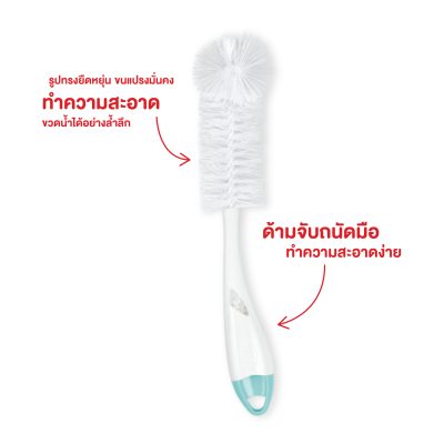 แปรงล้างจุกนมในตัว: มีแปรงขนาดเล็กสำหรับทำความสะอาด จุกนม (Teats) และเกลียวขวด โดยเฉพาะ ซึ่งถูกรวมเข้ากับด้ามจับของแปรงหลักอย่างชาญฉลาด ฟังก์ชัน 2-in-1 นี้ช่วยให้แปรงเล็กพร้อมใช้งานอยู่เสมอและไม่สูญหาย