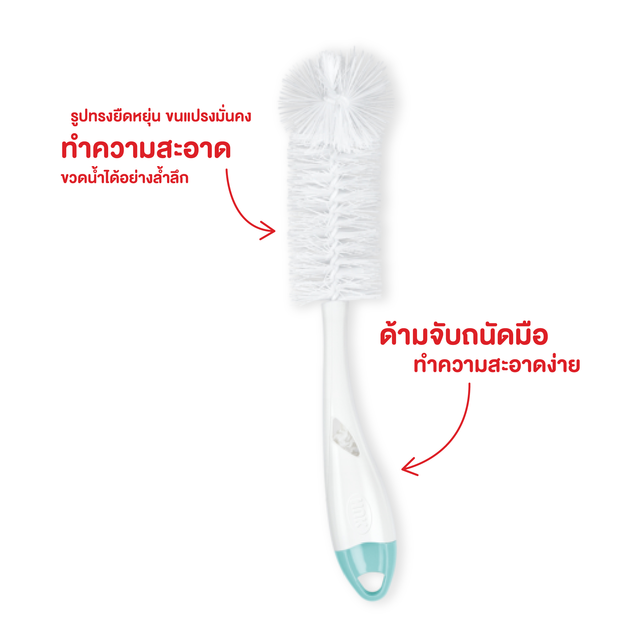 ทำความสะอาดอย่างทั่วถึง: รูปทรงแปรงที่ยืดหยุ่นและขนแปรงที่มั่นคงทนทาน รับประกันการทำความสะอาดที่สมบูรณ์และล้ำลึกทั้งภายในขวดและจุกนมที่บอบบาง