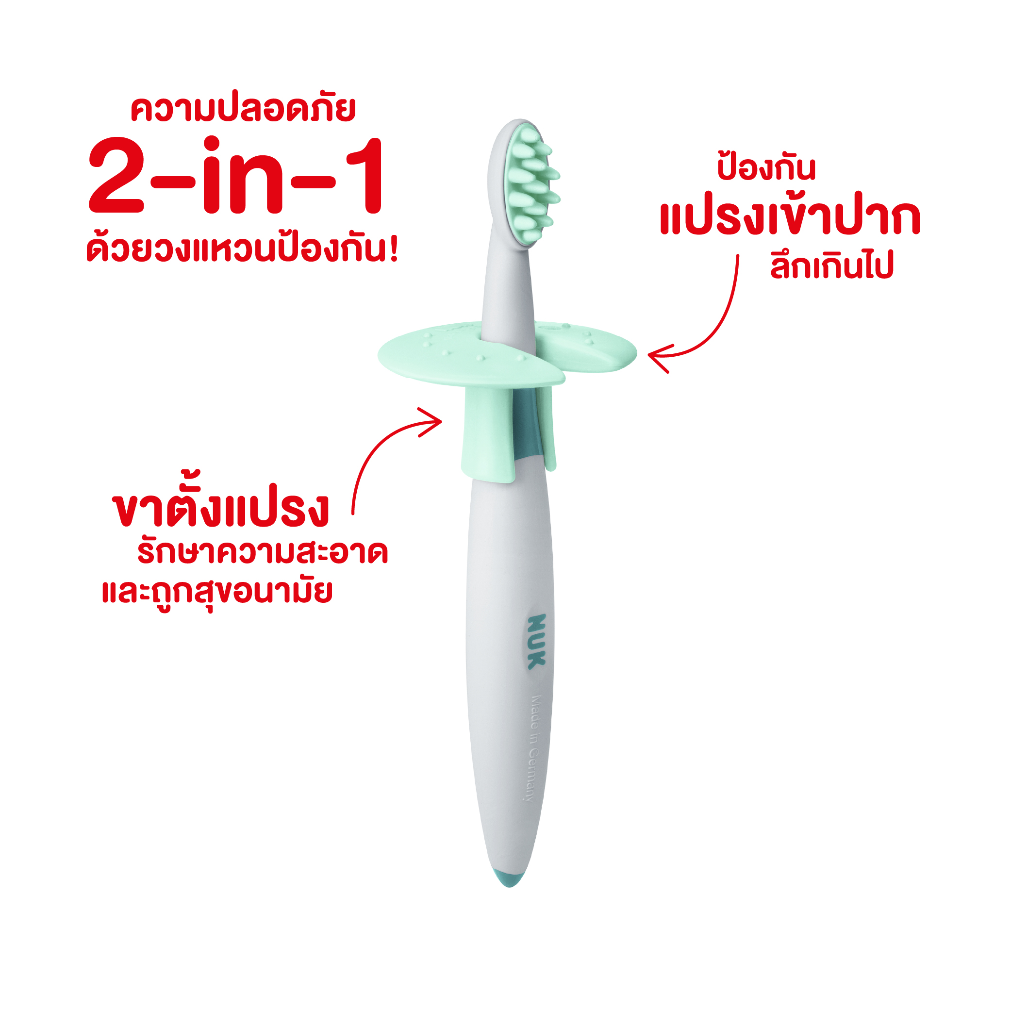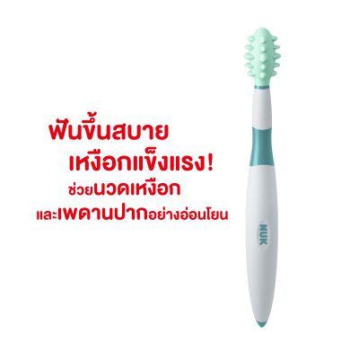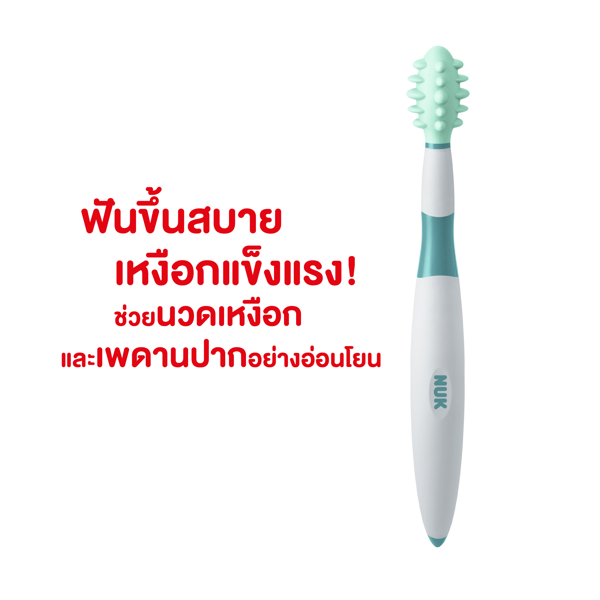 ขั้นตอนที่ 1: NUK Brush-and-Bite Teething Trainer (แปรงฝึกกัดและนวดเหงือก): ออกแบบมาให้เด็กสามารถใช้กัดได้ โดยจะช่วย นวดเหงือกและเพดานปาก อย่างอ่อนโยน เพื่อบรรเทาอาการปวดและไม่สบายตัวระหว่างการงอกของฟัน