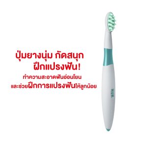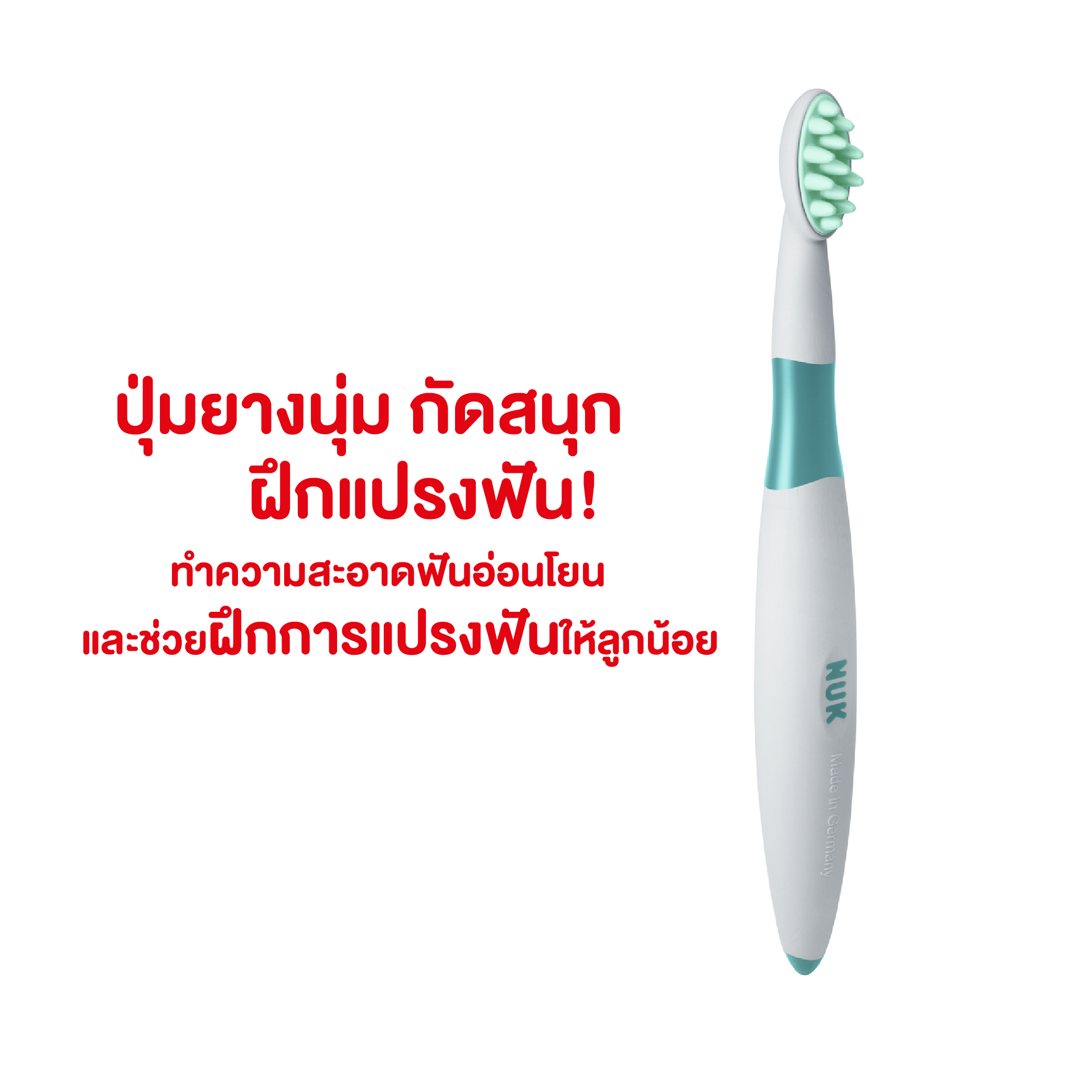 ขั้นตอนที่ 2: NUK Brushing Trainer (แปรงฝึกแปรงฟัน): มีปุ่มยางที่นุ่มและทนทานต่อการกัด ซึ่งช่วยทำความสะอาดฟันซี่เล็กๆ ที่เริ่มมองเห็นได้อย่างอ่อนโยน และช่วยสอนลูกน้อยให้เรียนรู้การเคลื่อนไหวที่ถูกต้องในการแปรงฟัน