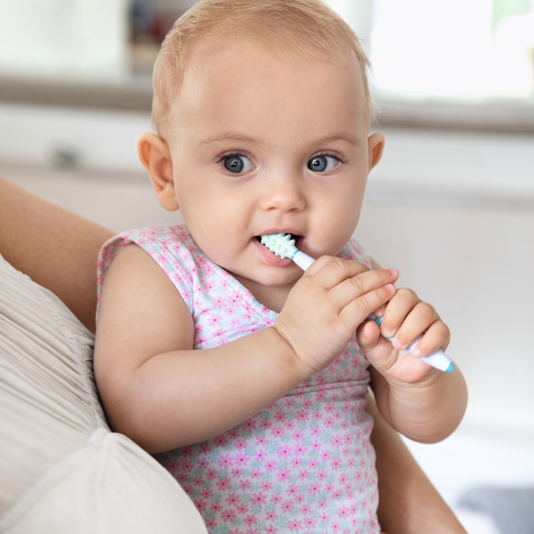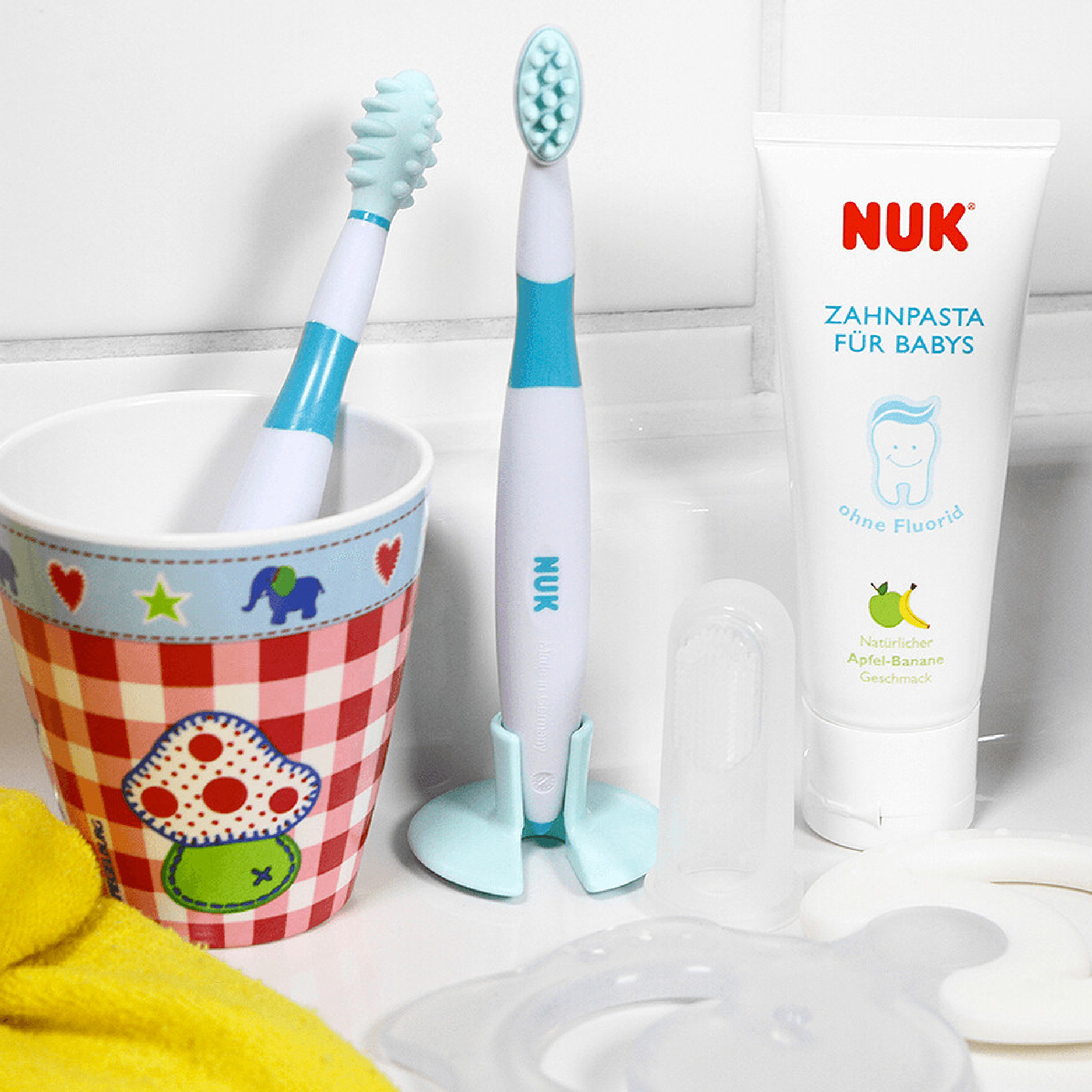 Step 2: NUK Brushing Trainer: Features soft, bite-resistant rubber tips that gently clean the first visible, little teeth and help teach your child the correct brushing movements.