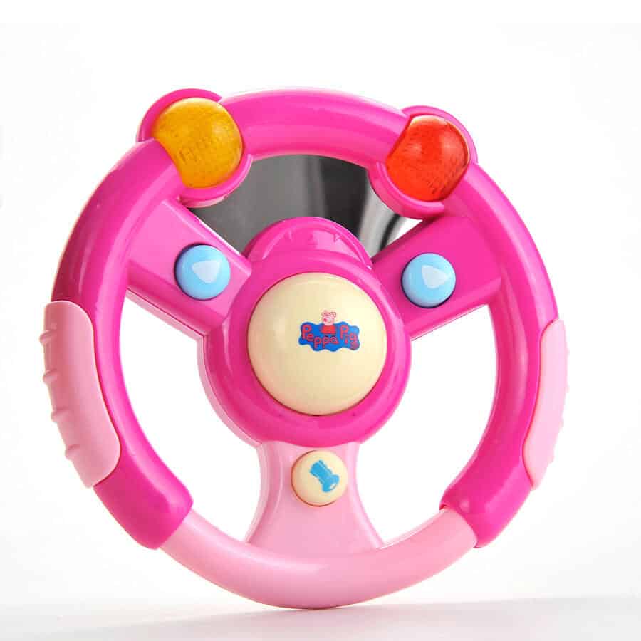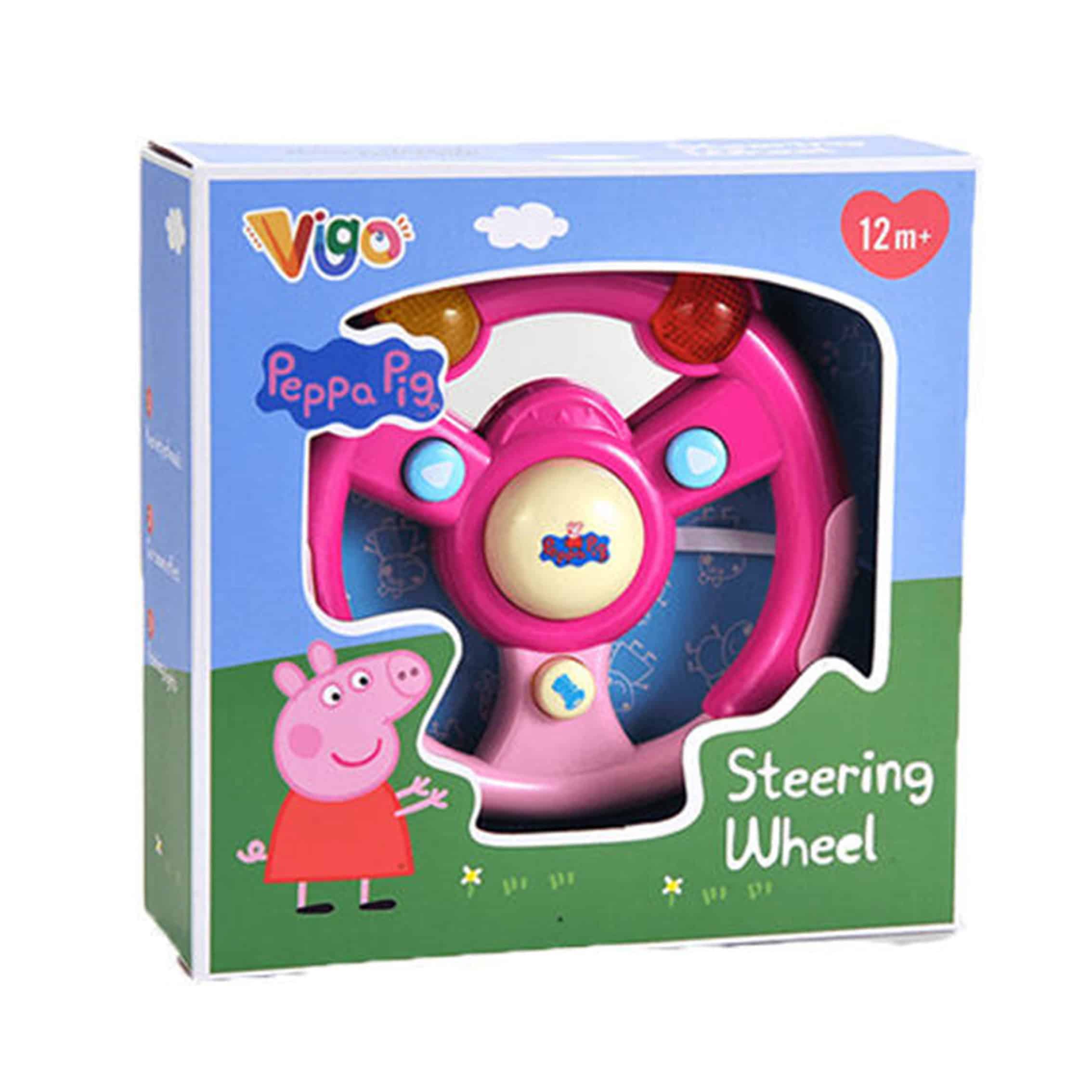• Peppa Pig Steering Wheel Music & Light Pink• Ages 12+ months and above.• Vigo toys presents the new• Peppa Pig Steering Wheel baby toy!The Peppa Pig Steering• Wheel comes with: A variety of different music!Flashing Lights!• Car sound effects! • Turn signals and Sound effects!• Realistic Honking Sounds!