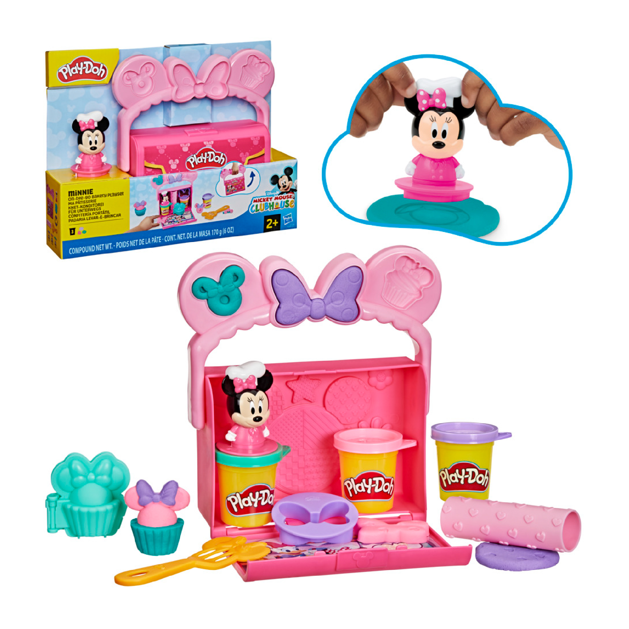 ฟิกเกอร์ Minnie Mouse พร้อมที่ปั๊มลาย: ฟิกเกอร์ Minnie Mouse สูงประมาณ 2.7 นิ้ว ด้านล่างเป็นที่ปั๊มลายเชอร์รี่จากดินน้ำมัน Play-Doh