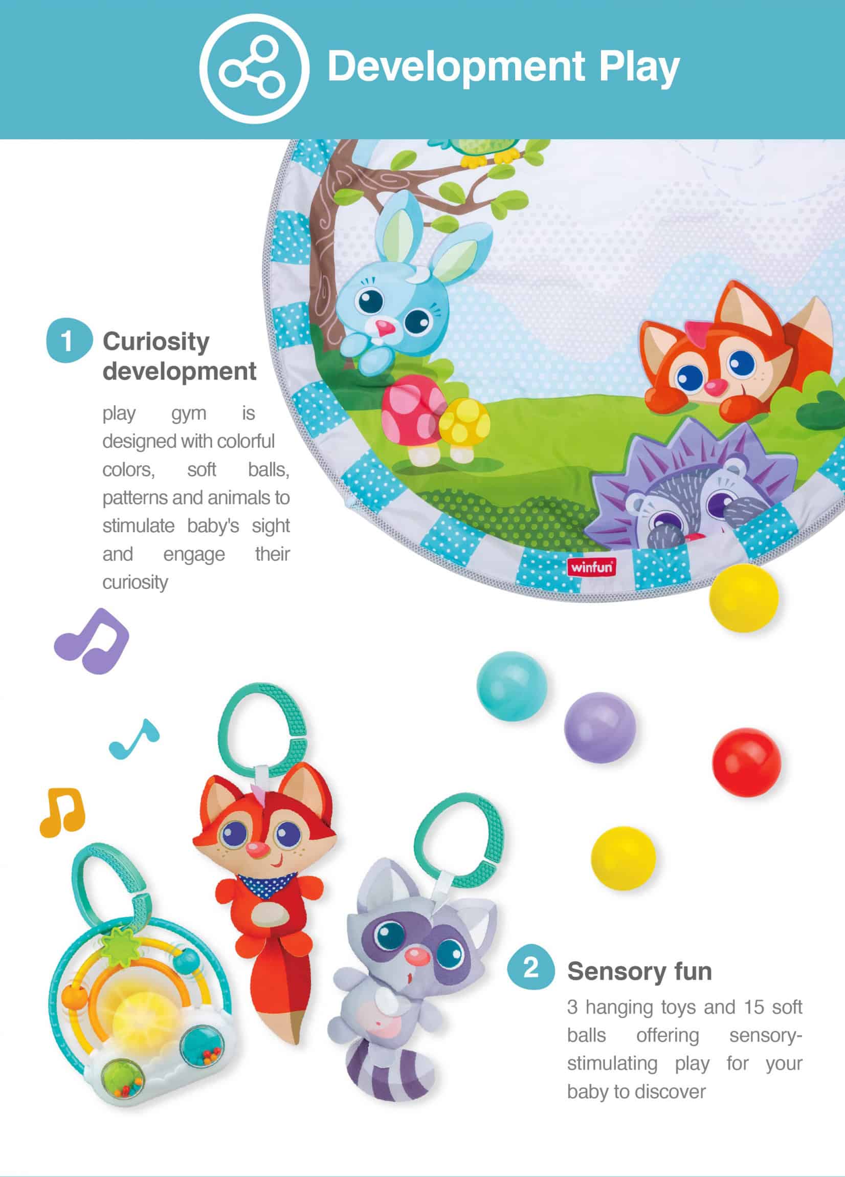 • เล่นสนุกบนเพลย์ยิมได้ถึง 9 กิจกรรม• สามารถให้เด็กนอนหงายเล่นได้ ฝึกทักษะการนอนคว่ำได้ หรือนั่งเล่นก็สามารถทำได้• ของเล่นแขวนน่ารัก ช่วยฝึกทักษะการหยิบกับเอื้อม• โมบายรูปสัตว์น่ารัก กระจกสำหรับเด็ก และโมบายสายรุ้งที่สามารถเปิดเพลงได้• เปลี่ยนจากเพลย์ยิมเป็นบ่อบอลได้ง่าย ๆ• สนุกไปกับพื้นที่เล่นขนาดใหญ่ 31 นิ้ว พร้อมลูกบอลถึง 15 ลูก• ของเล่นที่แขวนอยู่สามารถถอดออกได้ สนุกเพลิดเพลิน พกพาไปได้ทุกที่• เหมาะสำหรับทารกแรกเกิดนำเข้าและจัดจำหน่ายโดย บริษัท คิดโด แปซิฟิค จำกัด