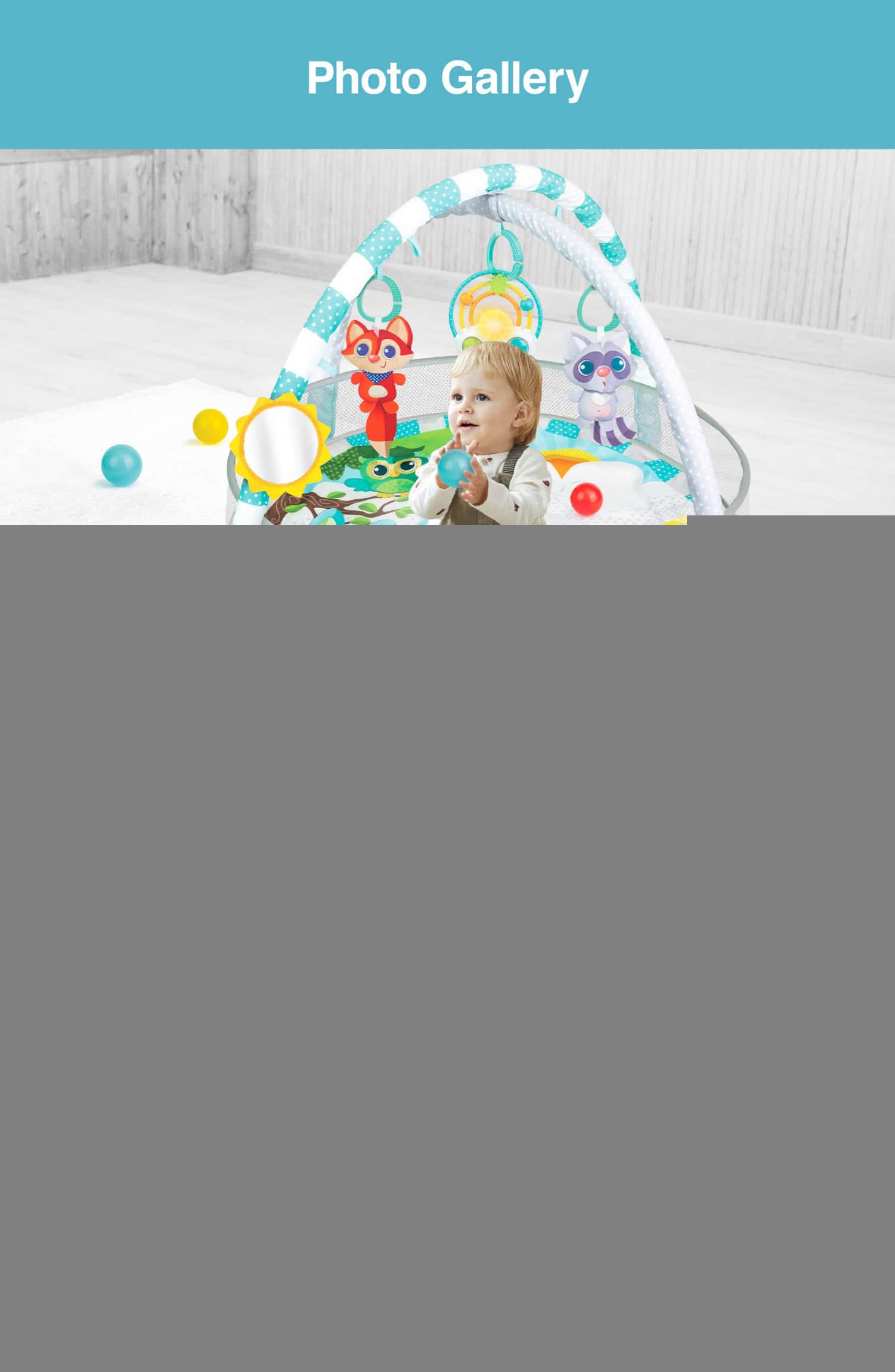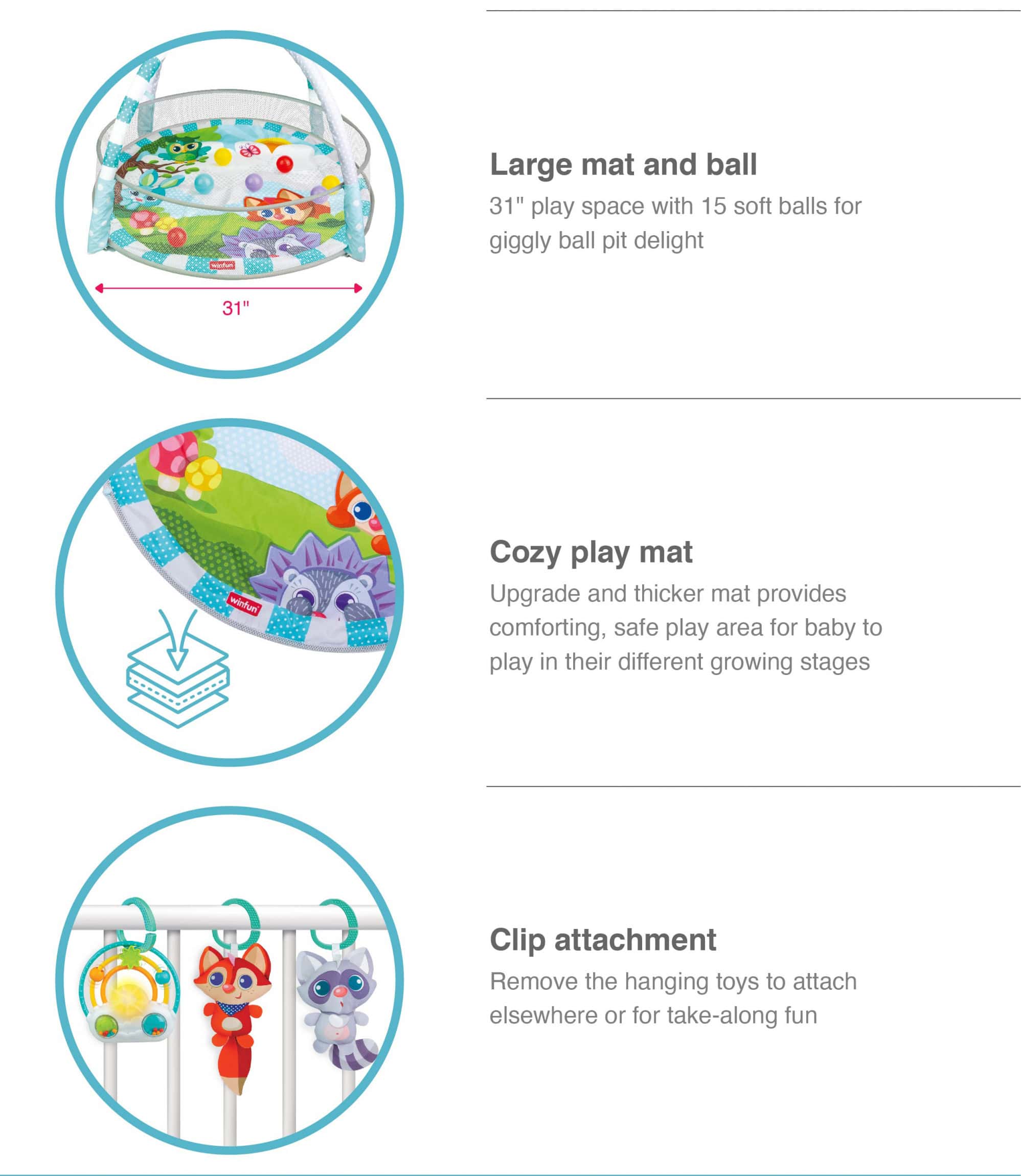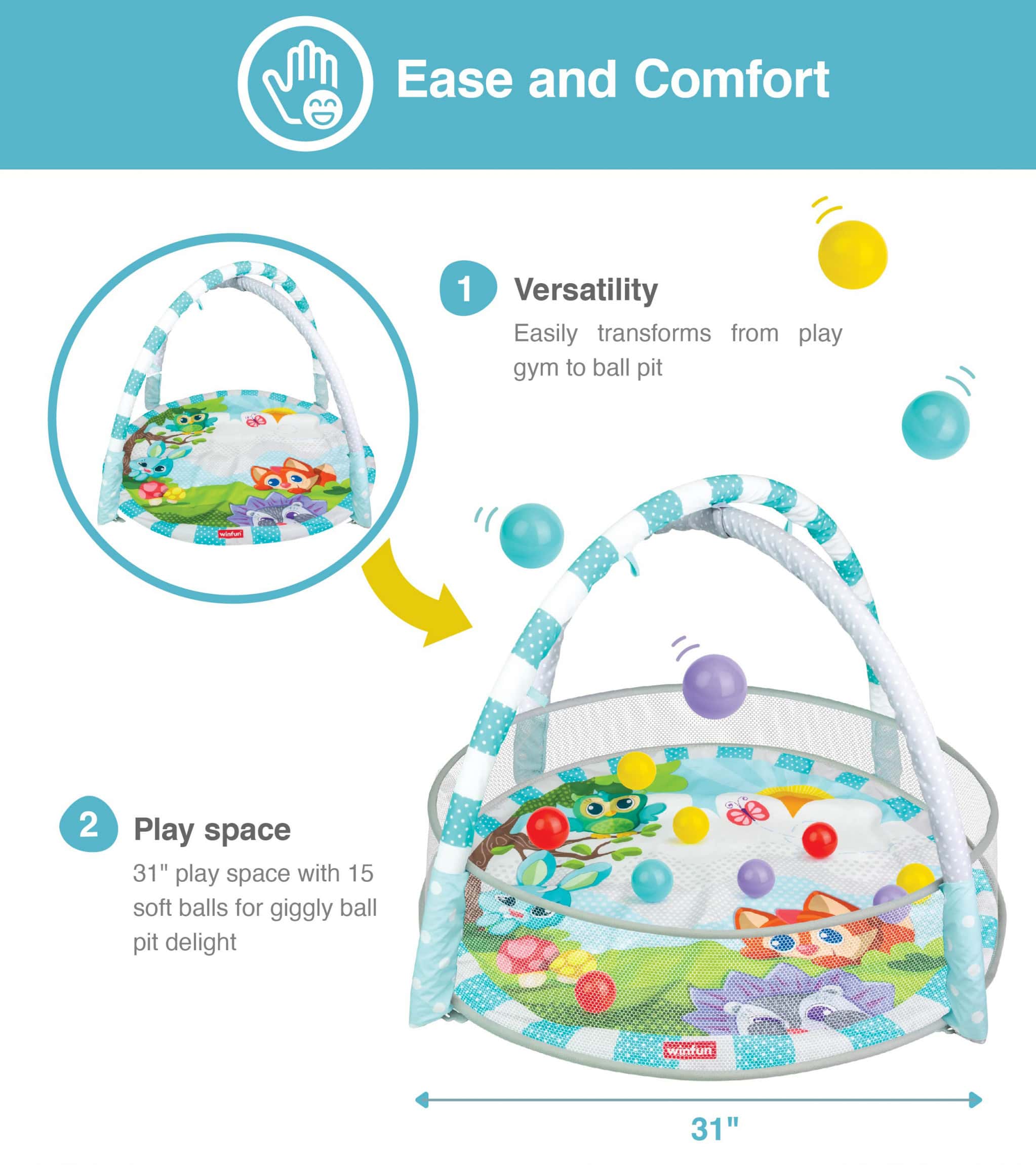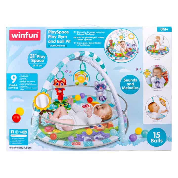 • Fun through the stages: lay and play, tummy time, and sit-up fun• Lovable hanging toys encourage reaching and grasping• Includes animal pals, baby-safe mirror, and light-up rainbow musical rattle• Easily transforms from play gym to ball pit• 31″ play space with 15 softballs for giggly ball pit delight• Remove the hanging toys to attach elsewhere or for take-along fun• Suitable for newborns