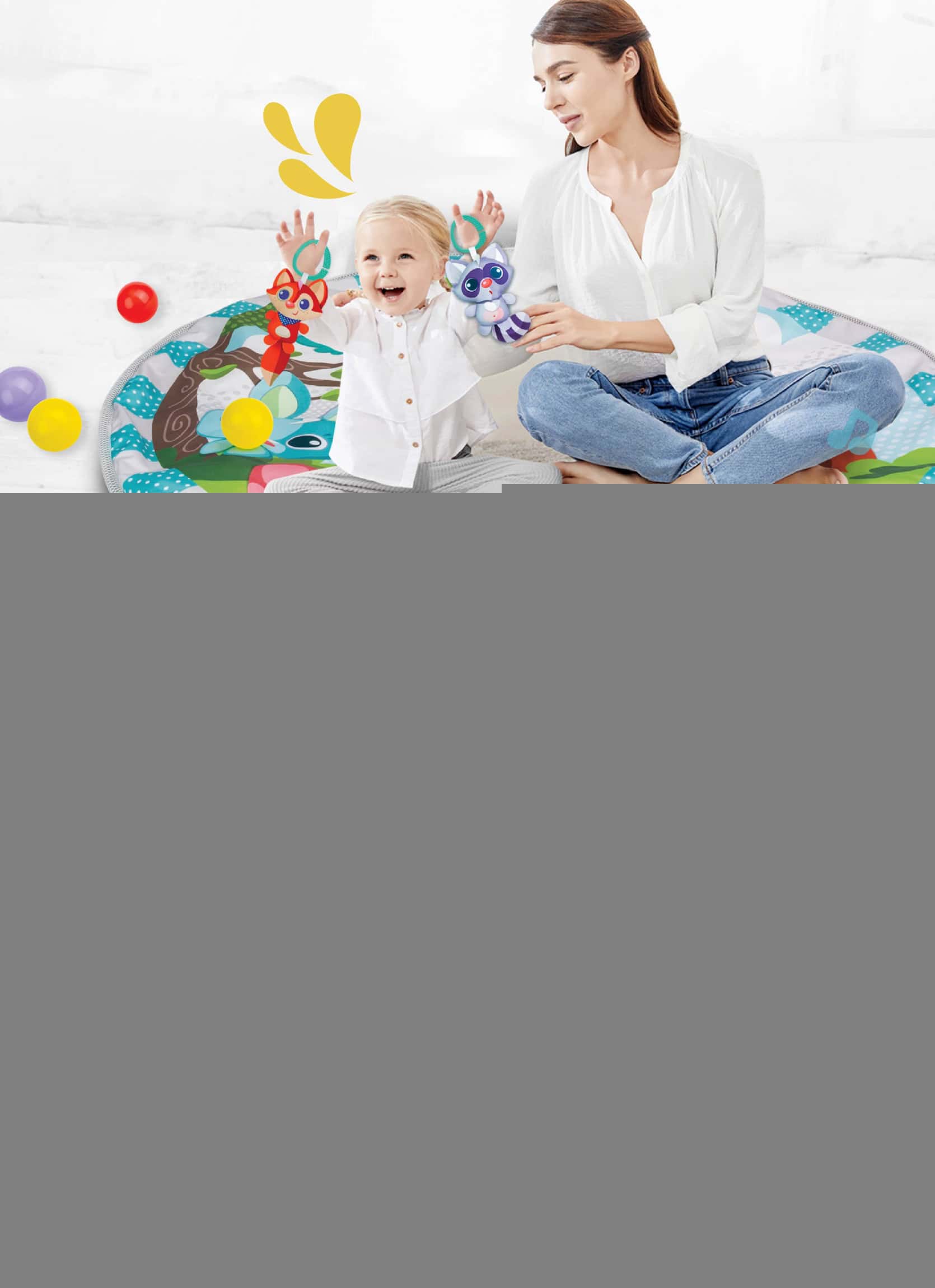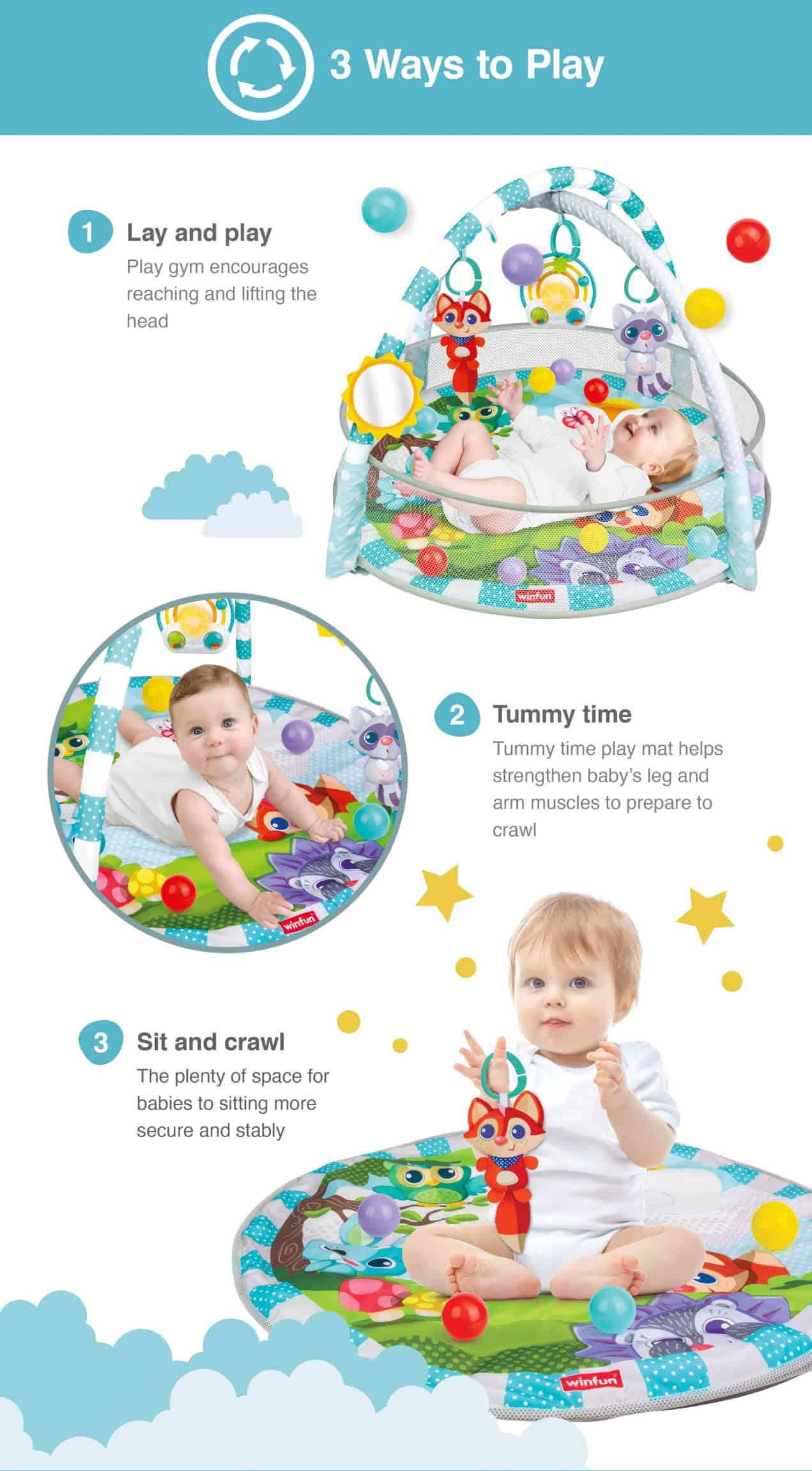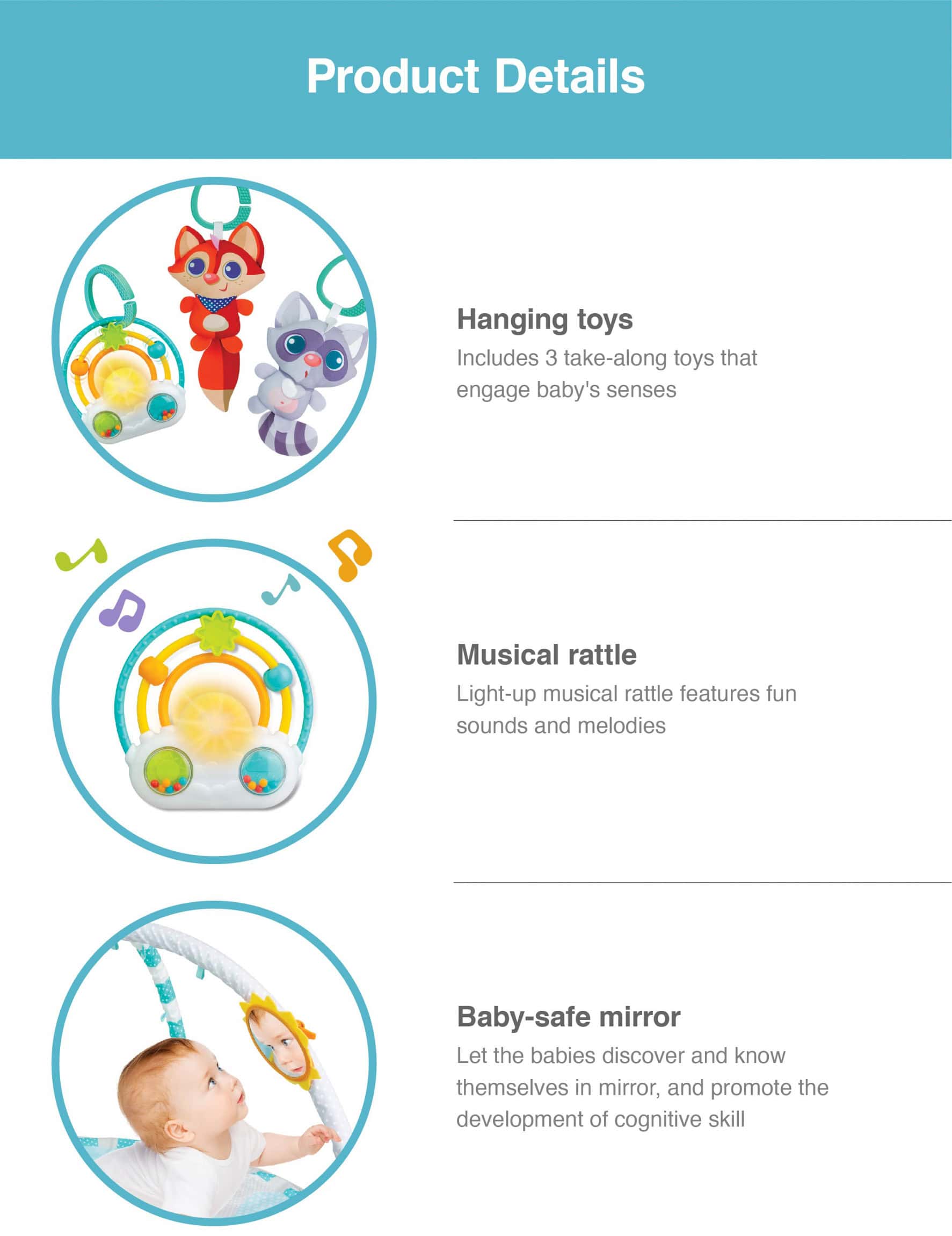 • Fun through the stages: lay and play, tummy time, and sit-up fun• Lovable hanging toys encourage reaching and grasping• Includes animal pals, baby-safe mirror, and light-up rainbow musical rattle• Easily transforms from play gym to ball pit• 31″ play space with 15 softballs for giggly ball pit delight• Remove the hanging toys to attach elsewhere or for take-along fun• Suitable for newborns