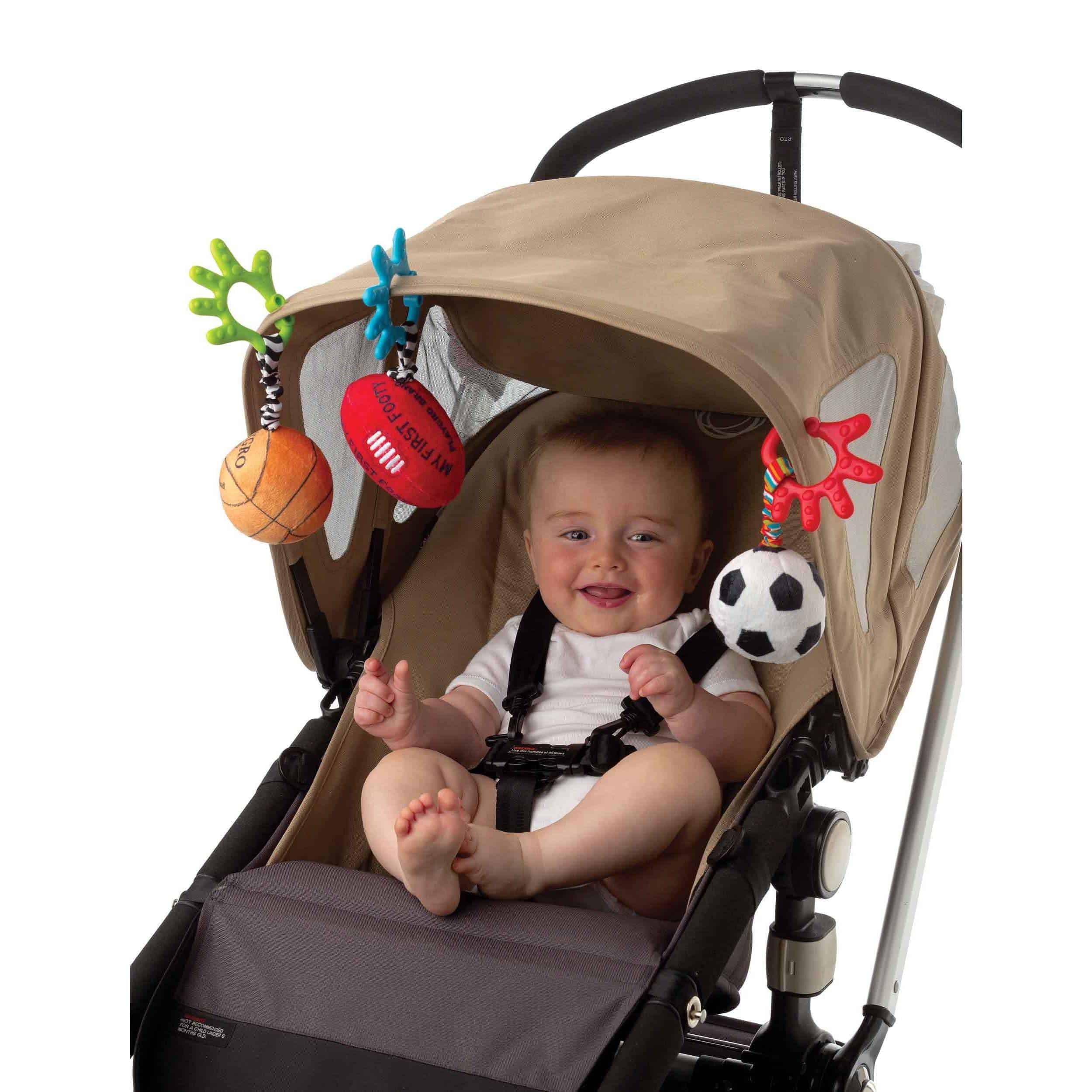 คลิปหนีบรูปมือที่มีพื้นผิวที่แตกต่าง สามารถติดกับรถเข็น คาร์ซีท บนรถยนต์ได้อย่างง่ายดายและเป็นของเล่นที่เหมาะสําหรับพกพาไปทุกที่ ประกอบด้วยลูกบอลกีฬา 3 ชนิดที่กระดิกได้และสั่นได้ กระตุ้นให้ทารกดูและจับในขณะที่กระตุ้นทักษะ การได้ยินการมองเห็นและการสัมผัส ลูกบอลแต่ละลูกมีขนาดพอดีมือเล็ก ๆ ทําให้เป็นของขวัญยอดนิยมสําหรับทารก