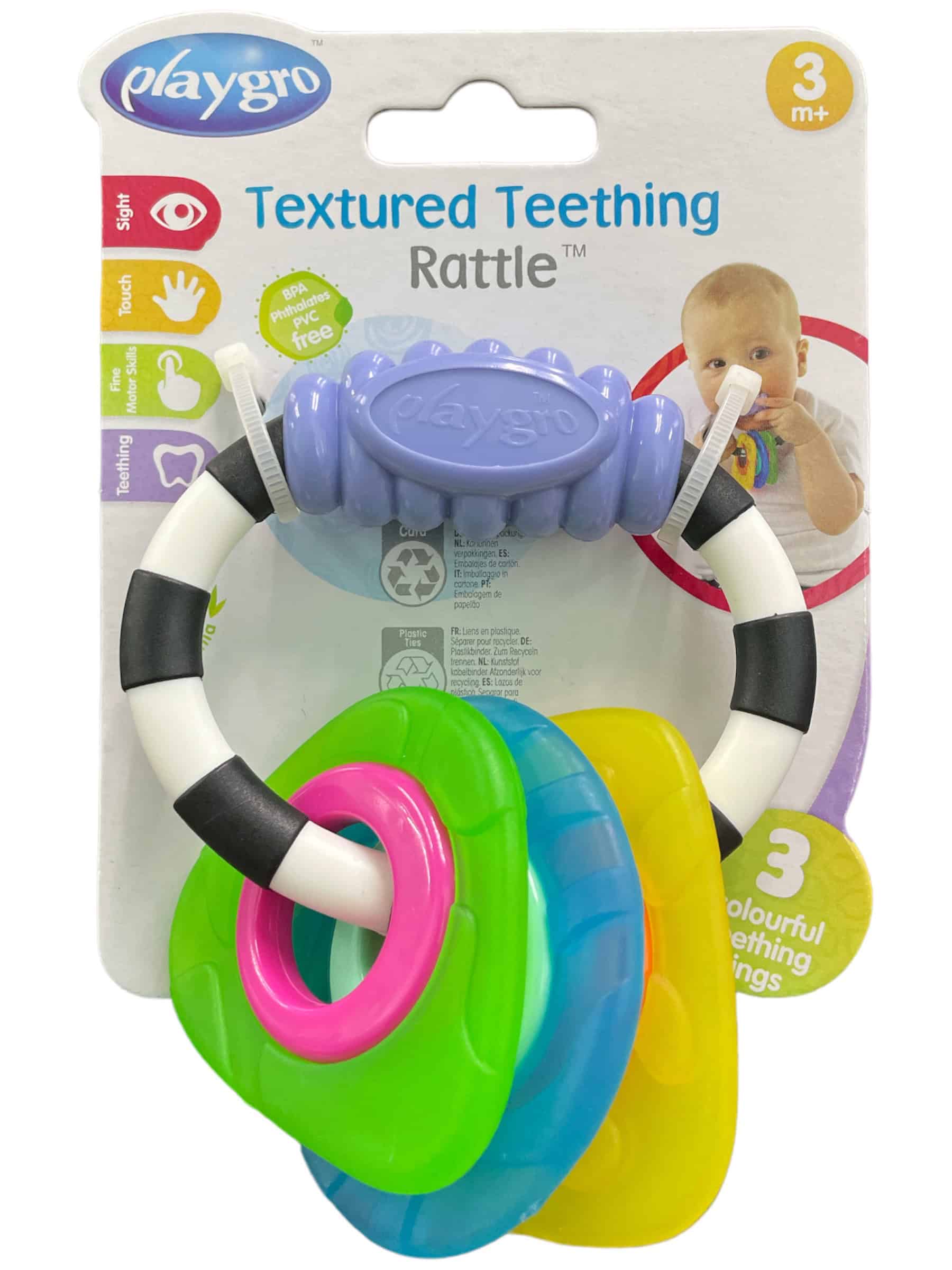 The bright engaging shapes of the Textured Teething Rattle are sure to entice baby. The soft chewy textured shapes are ideal for soothing sore gums, while click-clack sounds can be heard when shaken – perfect for auditory stimulation.