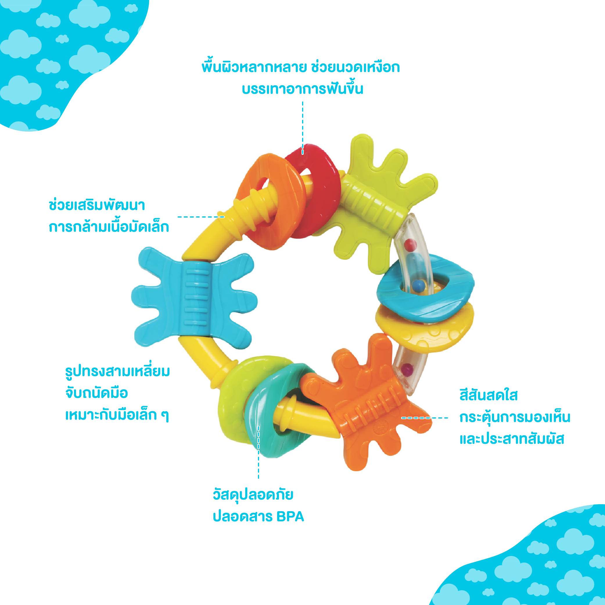 Playgro Triangle Teether ได้รับการออกแบบมาเพื่อมอบการบรรเทาที่มีประสิทธิภาพและดึงดูดใจสำหรับอาการปวดเหงือกของลูกน้อยในช่วงที่ฟันกำลังขึ้น ยางกัดที่จับง่ายนี้ผสมผสานพื้นผิวและสีสันที่หลากหลายเพื่อกระตุ้นประสาทสัมผัสพร้อมกับบรรเทาอาการไม่สบาย