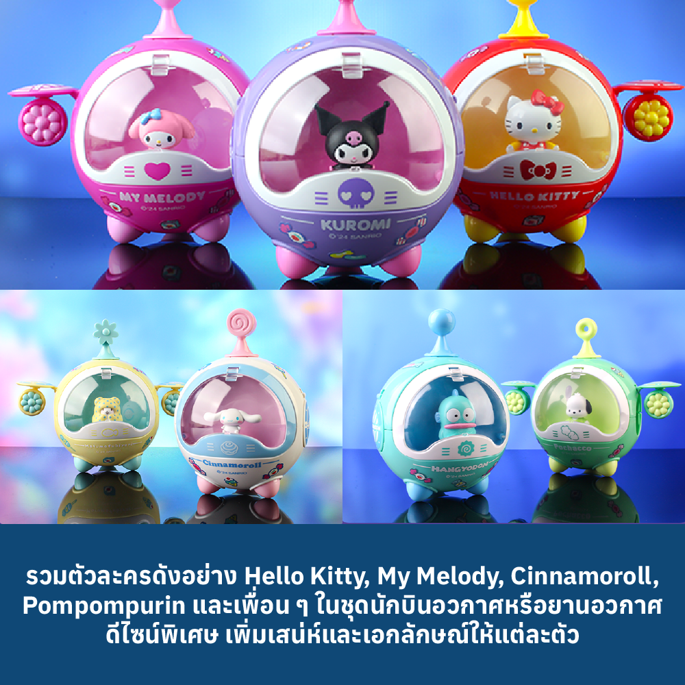 ตัวละครซานริโอ้ในธีมอวกาศสุดคิวท์: พบกับเพื่อนซานริโอ้สุดฮิต เช่น Hello Kitty, My Melody, Cinnamoroll, Pompompurin และตัวละครอื่น ๆ (จำนวนและตัวละครอาจแตกต่างกันไปในแต่ละชุดย่อย) ในชุดนักบินอวกาศหรือมาในรูปแบบยานอวกาศแคปซูล