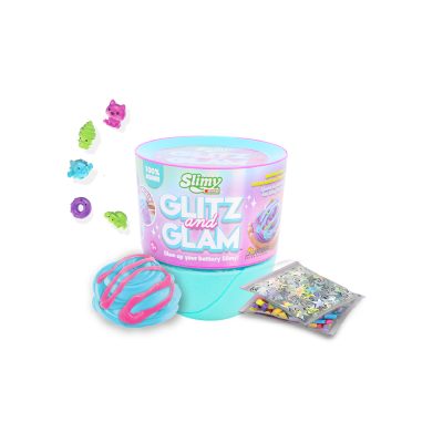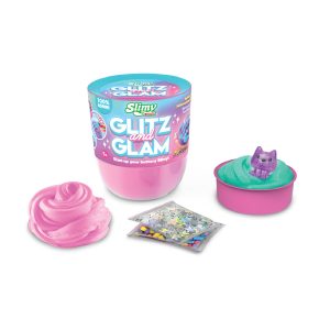 SLIMY GLITZ AND GLAM W DOME TOPPER PDQ by Slimy is a sparkly slime collection featuring a dome topper lid filled with decorative mix-ins, allowing kids to create their own glamorous slime designs.